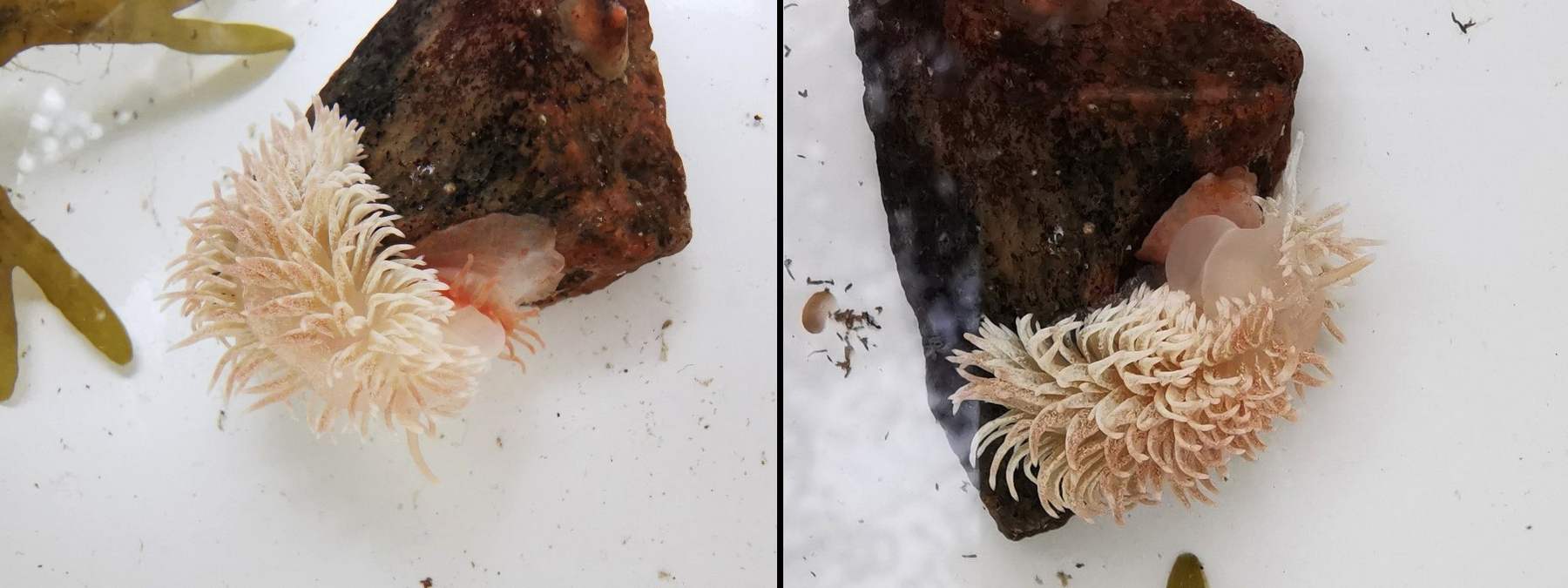 Вверху — эолидия нападает на мелкую актинию, не обращая внимания на шупальца. Внизу — половина дела сделана. Уже через полчаса после нападения актиния была оторвана от камня и проглочена целиком. Фото Н. Глаголевой, Белое море, 2022 год