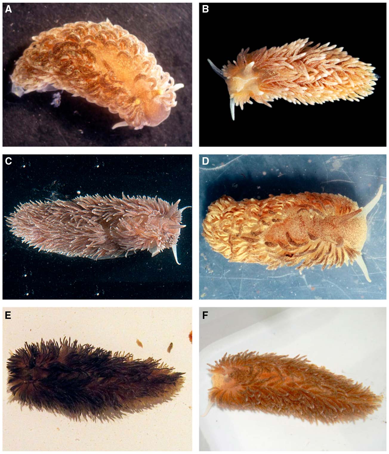 Такие разные эолидии пупырчатые... Морфотипы Aeolidia papillosa: А — Швеция, B — Кандалакшский залив Белого моря, С — Нидерланды, D — Массачусетс, Е — штат Вашингтон, F — Аляска. Фото из статьи Karen Kienberger et al., 2016. Aeolidia papillosa (Linnaeus, 1761) (Mollusca: Heterobranchia: Nudibranchia), single species or a cryptic species complex? A morphological and molecular study