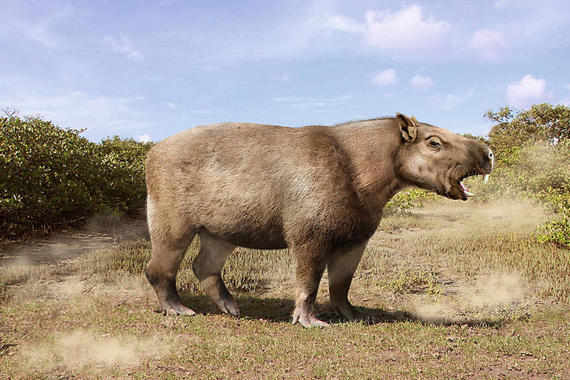 На реконструкции изображены южноамериканские токсодоны (Toxodon, «зуб-лук»). Эти животные были размером примерно с гиппопотама, но не имели отношения к современным парнокопытным. Их плоские передние резцы росли всю жизнь, как у грызунов, но белке или даже капибаре эти звери не ближе, чем слон. У них были смещенные кверху ноздри, глаза и уши, как у дюгоня, но и к сиренам токсодон не принадлежит даже кончиком хвоста. Этот зверь — настоящая ископаемая химера, словно бы составленная из частей разных животных. И два величайших ученых своего времени — Чарльз Дарвин, нашедший его череп, и Ричард Оуэн, описавший животное, — так и не смогли догадаться, кто же такой токсодон на самом деле.