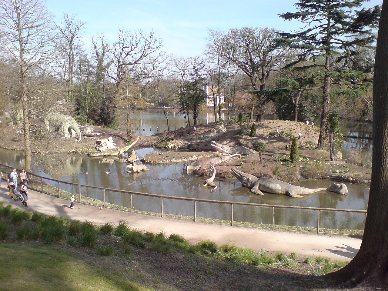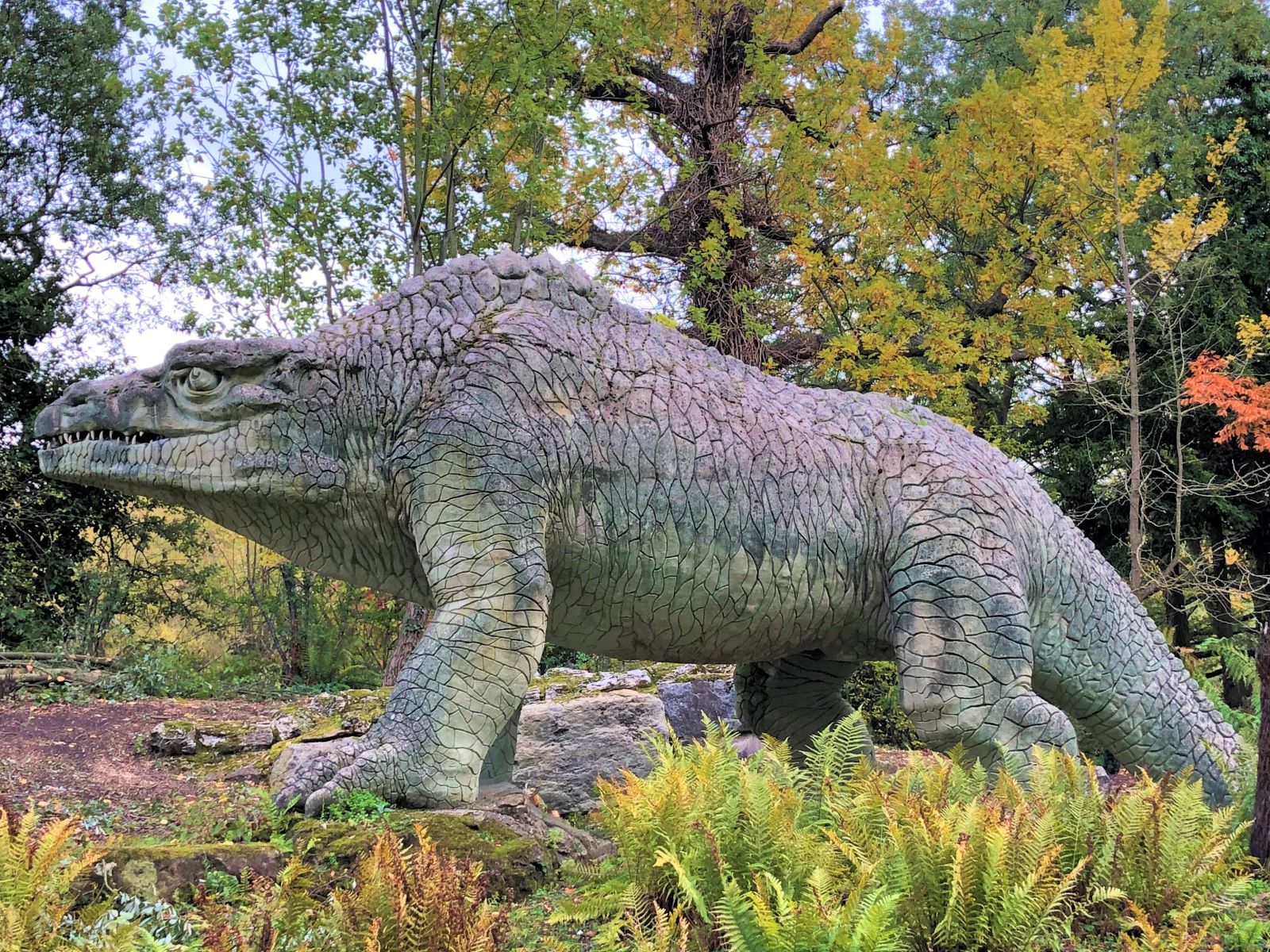 Динозавров среди выставленных скульптур немного: из пятнадцати родов изображенных животных к «ужасным ящерам» относятся только три. Больше всего похож сам на себя гилеозавр (Hylaeosaurus armatus), напоминающий гигантскую игуану: по крайней мере, в том, что этот небольшой панцирный динозавр передвигался на четырех ногах и был покрыт шипами, ученые не сомневаются до сих пор.