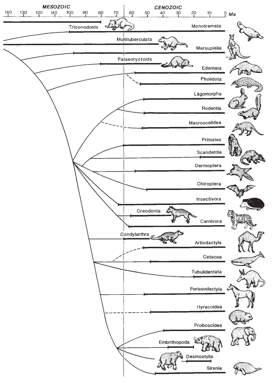 К XX веку система млекопитающих на отрядном уровне более-менее устоялась. Стало ясно, что в класс млекопитающих входят три давно разошедшихся эволюционных ствола: однопроходные, сумчатые и плацентарные. Сейчас нас интересуют только последние. Американец Джордж Симпсон, крупнейший в XX веке исследователь эволюции млекопитающих, выделял 16 отрядов плацентарных: насекомоядные, шерстокрылы, рукокрылые (летучие мыши и крыланы), приматы (включая тупай), неполнозубые, панголины, зайцеобразные, грызуны, китообразные, хищные (включая ластоногих), трубкозубы, хоботные, даманы, сирены, непарнокопытные и парнокопытные. Среди них есть такой гигантский отряд, как грызуны, а есть и отряд трубкозубов, в котором всего-навсего один современный вид. Но все они, по замыслу Симпсона, должны были соответствовать эволюционным ветвям примерно одного ранга.