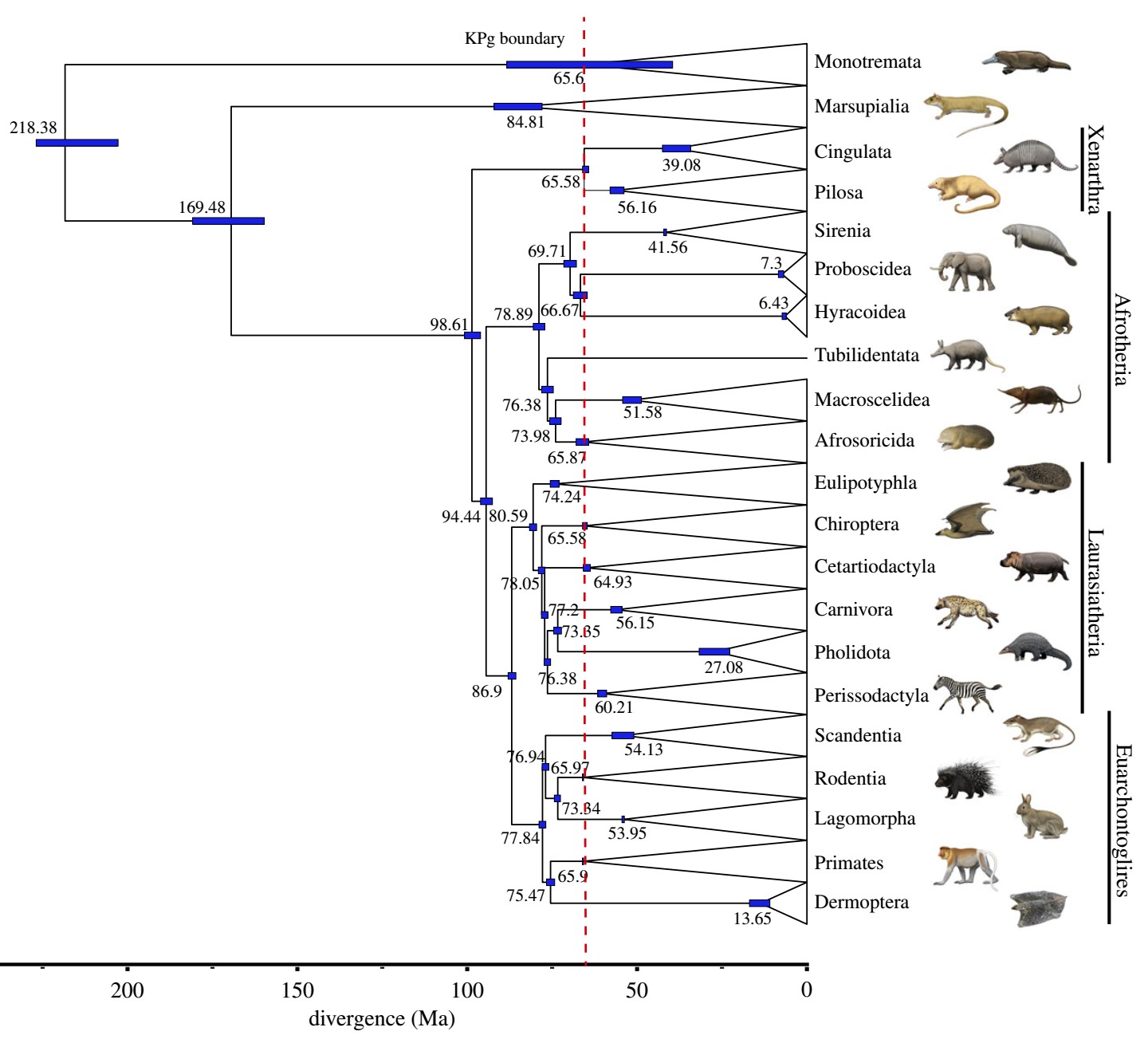 Молекулярное древо млекопитающих. Здесь хорошо видны ветви Laurasiatheria, Euarchontoglires, Xenarthra и Afrotheria и изображены их представители. Рисунок из статьи R. W. Meredith et al., 2011. Impacts of the Cretaceous Terrestrial Revolution and KPg Extinction on Mammal Diversification