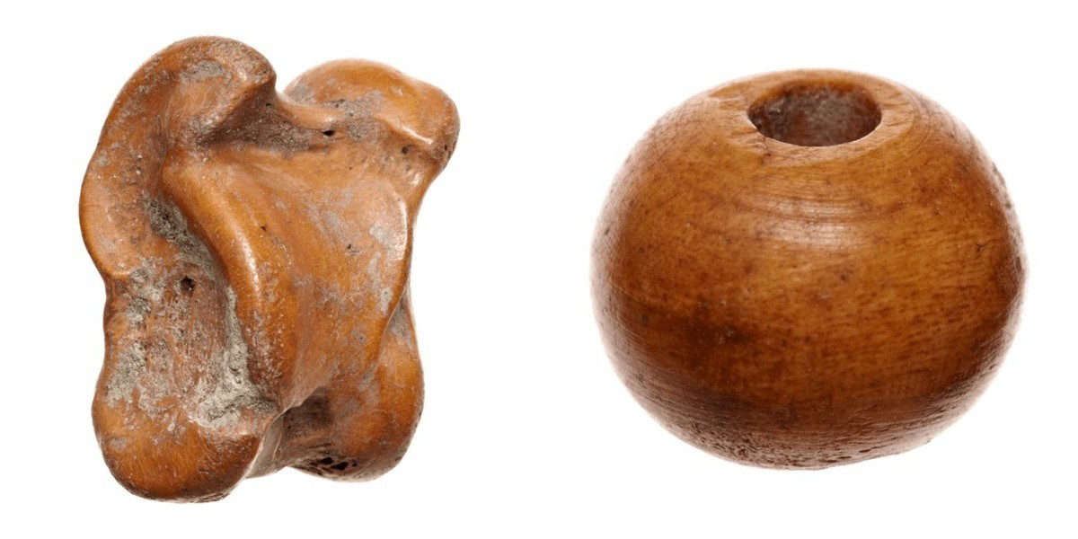 Слева — бабка из таранной кости козы или овцы, 1200–1600 гг. Справа — костяная бусина для четок, 1250–1600 гг. Фото с сайта belowthesurface.amsterdam