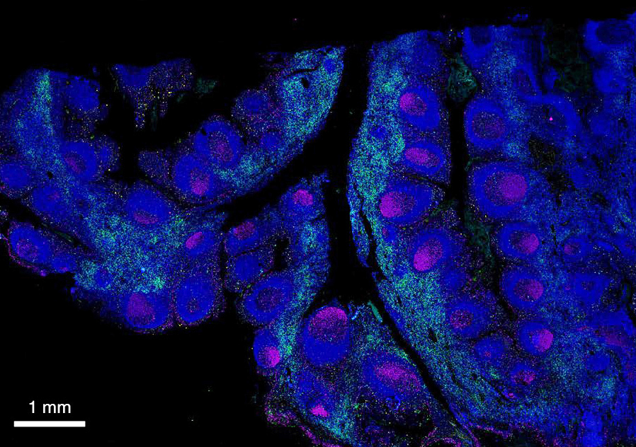 Как и любые другие иммунные органы, миндалины имеют сложную клеточную архитектуру. Для ее визуализации используют методы пространственной биологии, в частности пространственной протеомики, когда окрашивают ткани на различные клеточные типы с помощью белков — маркеров клеток. Один из основных методов пространственной биологии — мультиплексная иммунофлуоресценция, которая и была использована для получения главного изображения. С ее помощью в ткани можно визуализировать десятки различных клеточных типов (при условии, что для каждого из них мы знаем специфический белок или маркер).