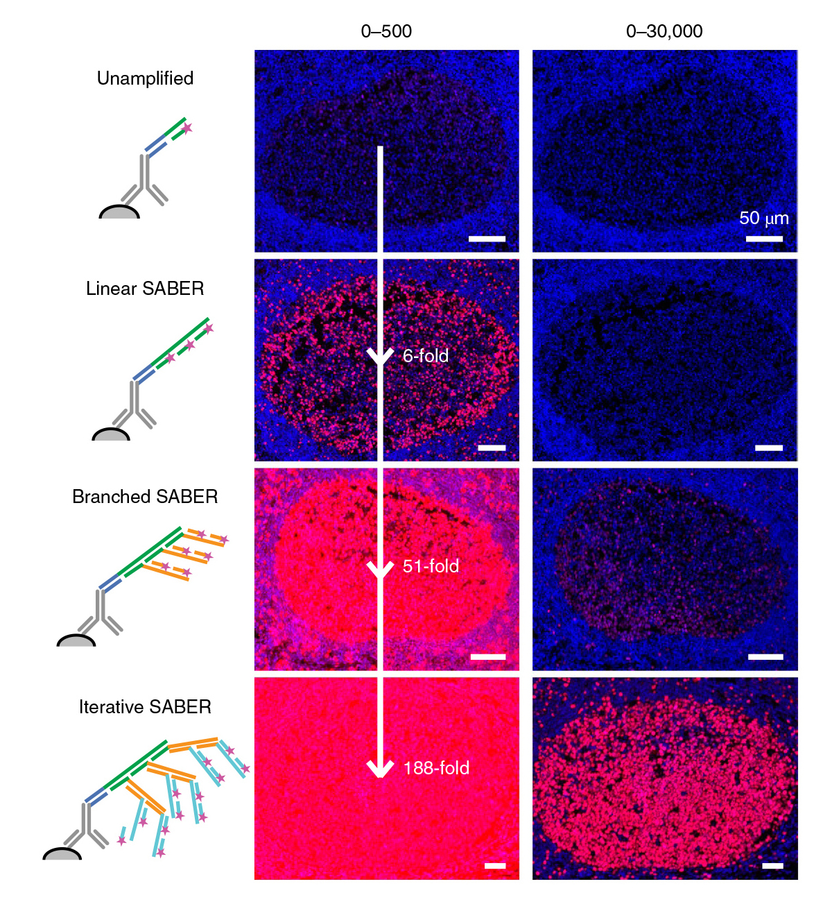 Сравнение традиционного метода окрашивания с помощью меченых антител и ImmunoSABER — линейного, разветвленного и разветвленного с заменой ветвей. Последний способ усиливает сигнал в 188 раз. Изображение из статьи S. K. Saka et al., 2019. Immuno-SABER enables highly multiplexed and amplified protein imaging in tissues