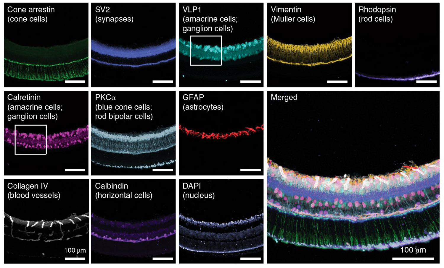 Поперечный срез сетчатки мыши, окрашенный с применением десяти маркеров. На объединенном изображение видны разные типы клеток ткани. Фото из статьи S. K. Saka et al., 2019. Immuno-SABER enables highly multiplexed and amplified protein imaging in tissues