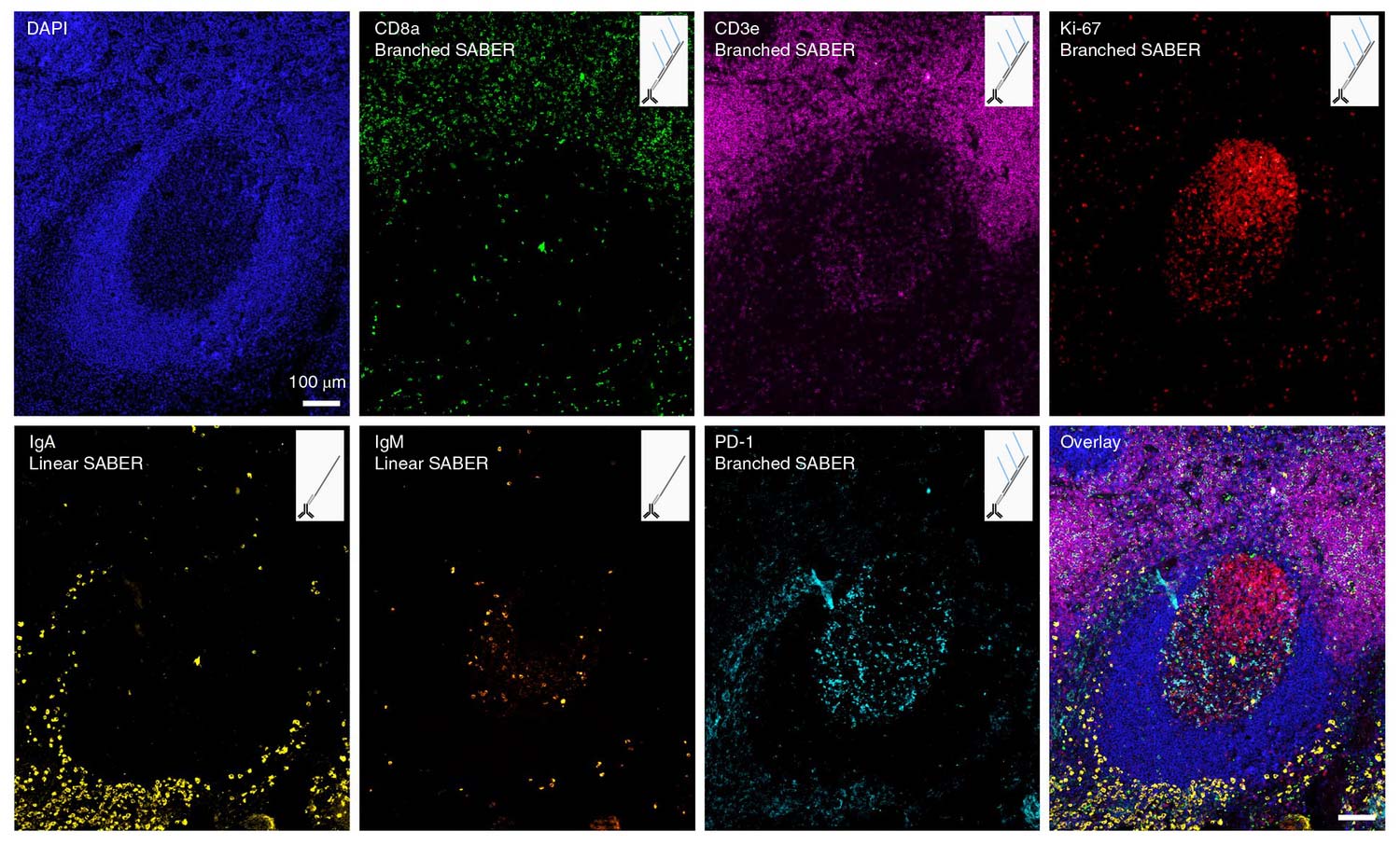 В Immuno-SABER используется особый способ усиления, или амплификации, сигнала флуоресценции. Антитела в данном методе конъюгируют со специальными нуклеотидными последовательностями ДНК, которые затем комплементарно связывают более короткие последовательности, соединенные с флуорофорами. Такой метод позволяет усилить сигнал в 5–180 раз и использовать до десяти маркеров.