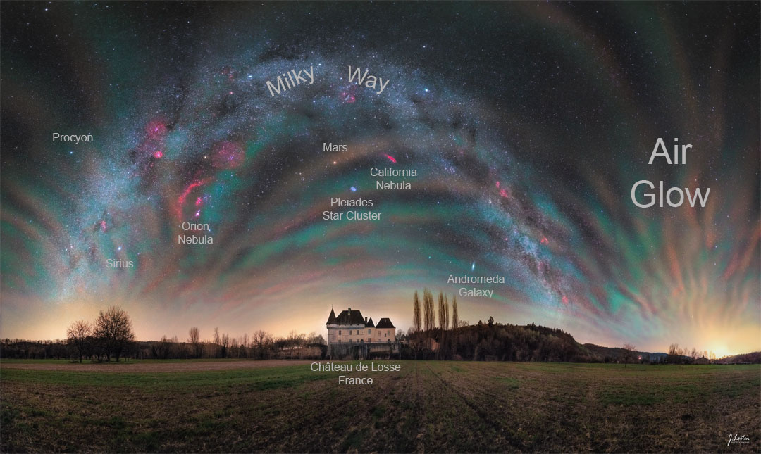 На этом панорамном фото запечатлен Млечный Путь над живописным средневековым поместьем во Франции. Чтобы получить такой снимок, астрофотографу Жульену Лутену (Julien Looten) понадобилось сделать 40 кадров в течение часа. На фоне молочной звездной дуги в левой части снимка хорошо заметно газопылевое облако Ориона, включающее туманность Петля Барнарда (красная полудуга на снимке), туманность Ориона (в нижней части внутри полудуги), молекулярное облако Шарплесс 264 (красное облачко над Петлей Барнарда), звездные ассоциации и другие объекты (см. картинку дня Орион с «подбитым» плечом).