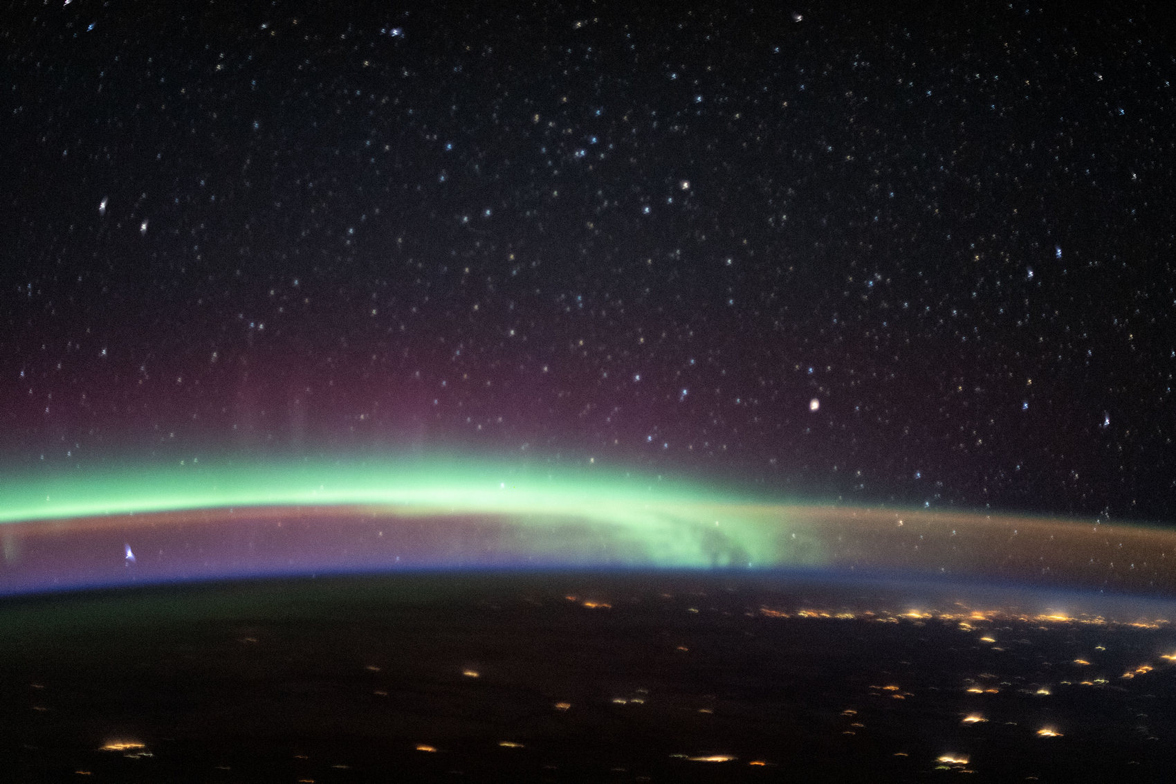 Вот так выглядят встретившиеся перед рассветом полярное сияние и собственное свечение атмосферы. Фото с сайта earthobservatory.nasa.gov, сделано с борта МКС 16 марта 2020 года, когда станция пролетала немного южнее Аляски