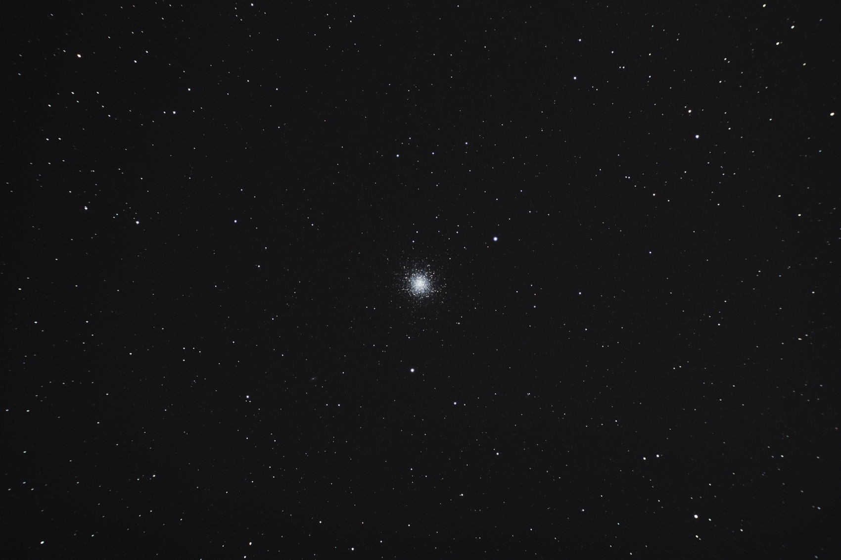 На фото — шаровое звездное скопление М13 в созвездии Геркулеса. Это один из самых ярких объектов глубокого космоса в Северном полушарии. Его видимая звездная величина +5,8m (см. статью Звёздные величины) позволяет наблюдать его в небольшие бинокли и даже невооруженным глазом при хороших условиях (чистая атмосфера, отсутствие Луны и городских огней).