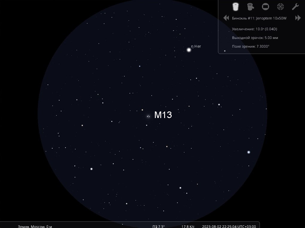 Так будет выглядеть М13 в бинокль 10×50; η Her — звезда Эта Геркулеса. Изображение из программы Stellarium