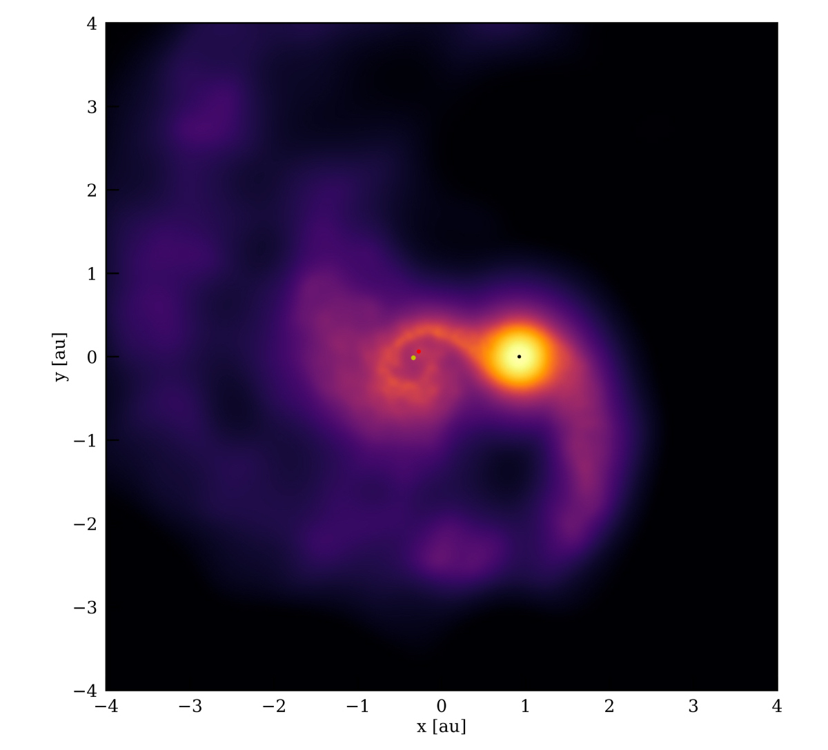 Смоделированное изображение переноса вещества. Двойная система слева получает вещество от гигантского компаньона справа. Изображение с сайта aasnova.org