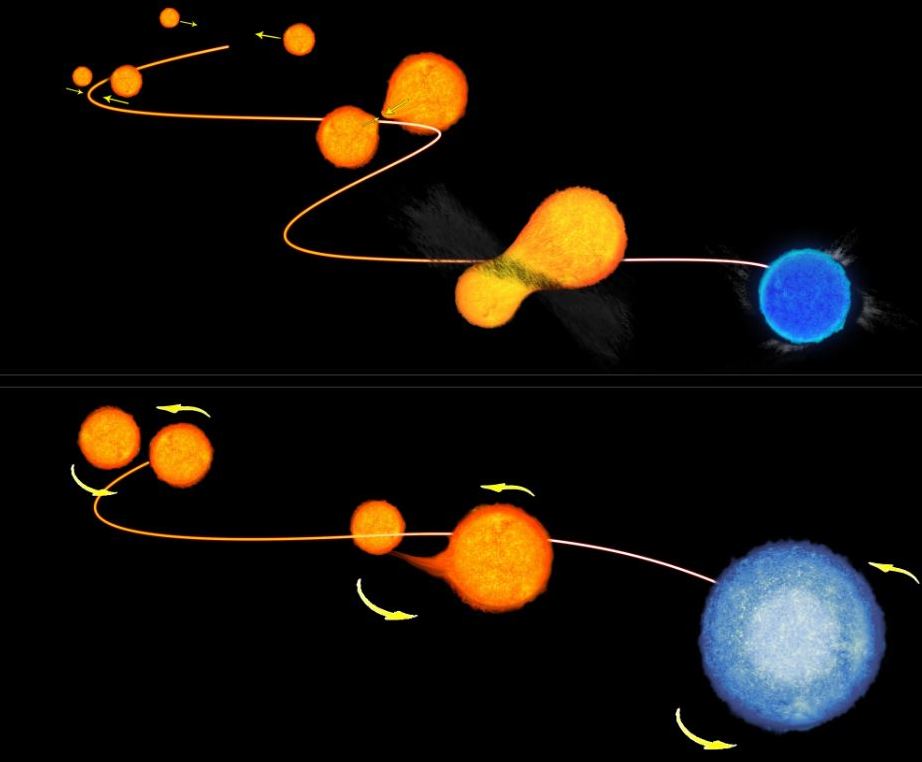Схема появления голубых странников при взаимодействии двух звезд. Сверху — столкновение, снизу — перенос вещества при взаимодействии двойной звезды. Изображение с сайта cosmic-lab.eu