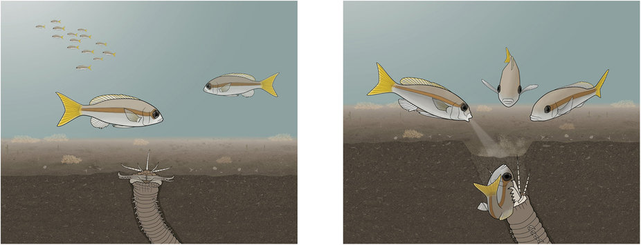 Рыбки Scolopsis affinis, атакующие боббита после того, как он схватил их сородича. Рисунок из статьи J. Lachat, D. Haag-Wackernagel, 2016. Novel mobbing strategies of a fish population against a sessile annelid predator