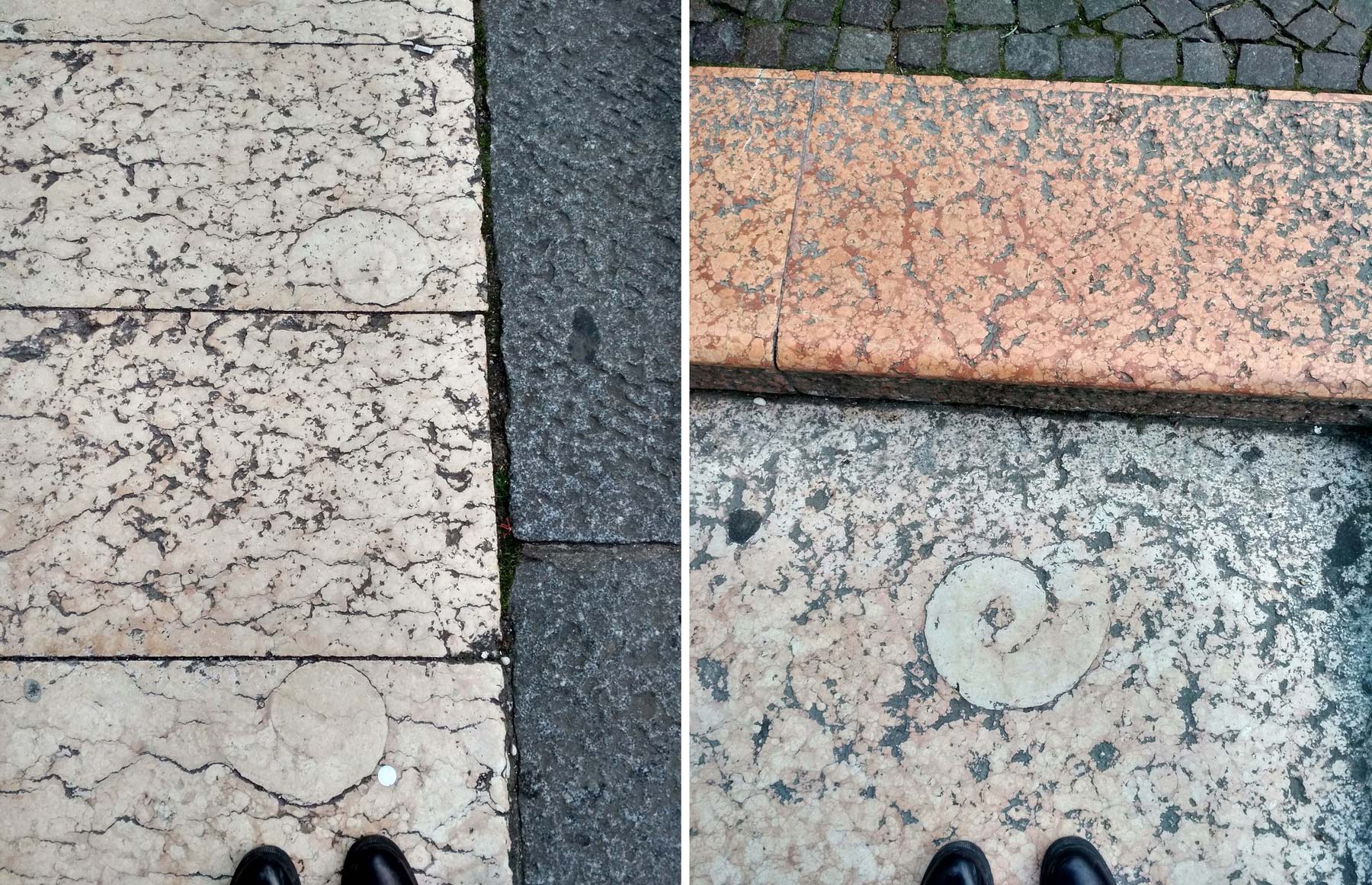 Остатки аммонитов и белемнита на ступенях Арены-ди-Верона. Фото Юлии Михневич, Верона, Италия, 14 января 2020 года