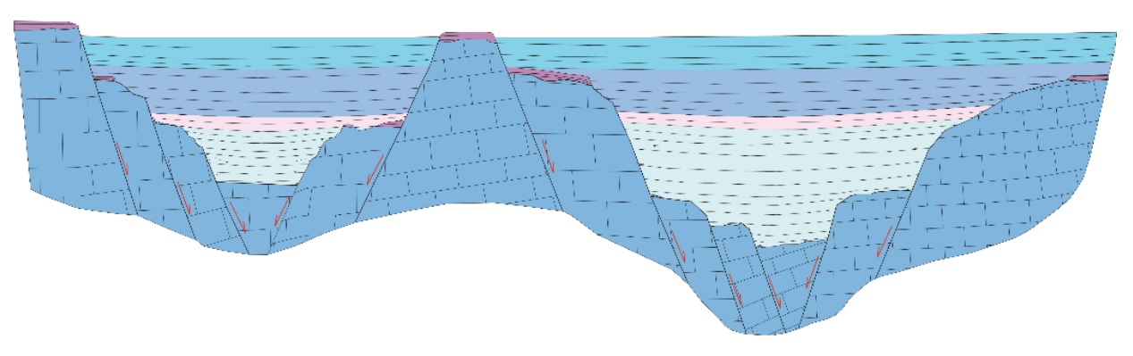Схематический геологический разрез с двумя грабенами, заполненными слоистыми отложениями. Розовым отмечены уровни распространения известняков Rosso Ammonitico. Рисунок из статьи P. Farabollini, F. Bendia. 2022. Frasassi Caves and Surroundings: A Special Vehicle for the Geoeducation and Dissemination of the Geological Heritage in Italy