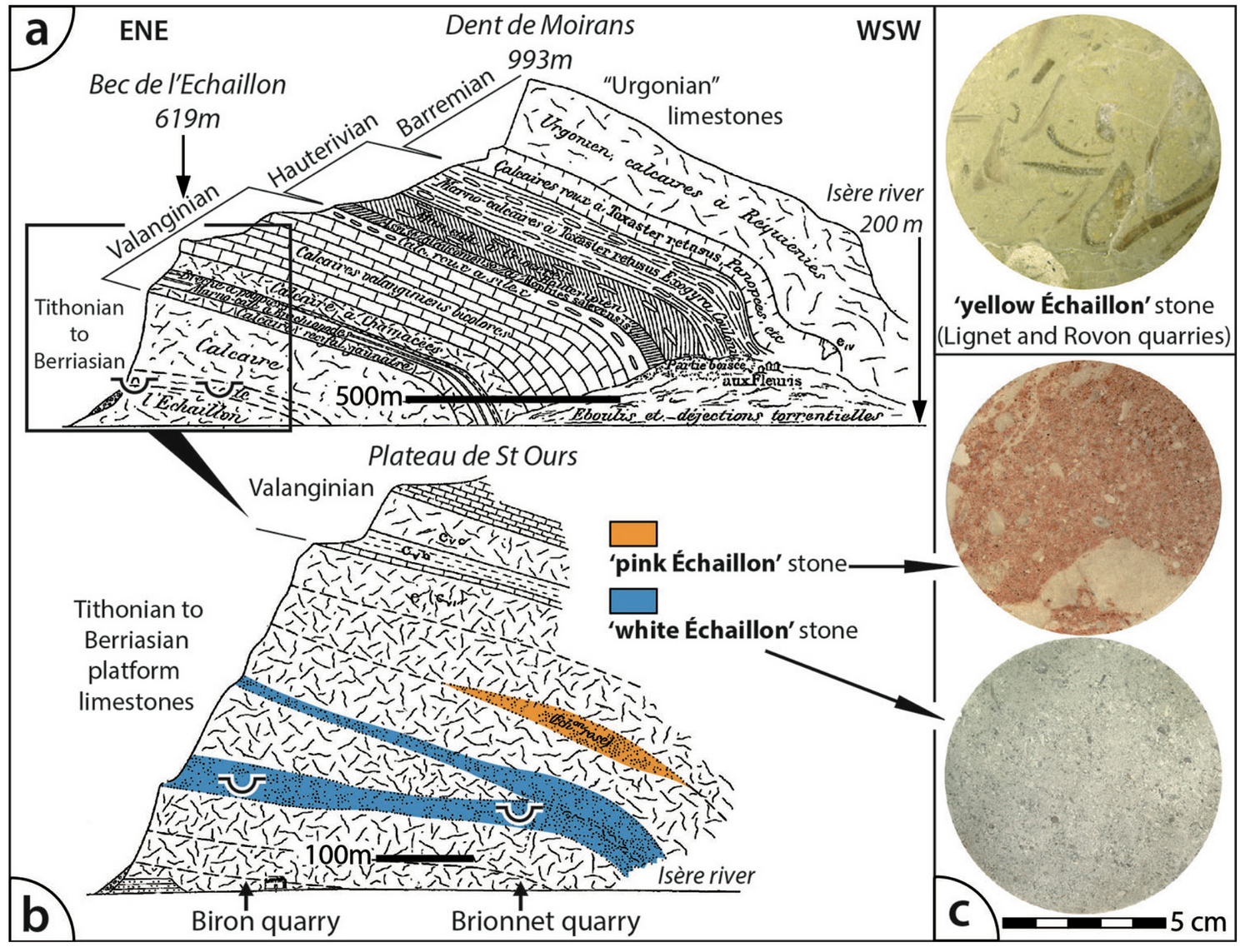 Геологический разрез мыса Эшайон (a) и его разрабатываемая часть более детально (b), обозначены слои белой и розовой разновидностей Эшайона с указанием мест их залегания в пределах основных осадочной толщи; (c) макроскопический вид трех разновидностей добываемого камня Эшайон. Рисунок из статьи T. Dumont, 2020. Échaillon stone from France: a Global Heritage Stone Resource proposal