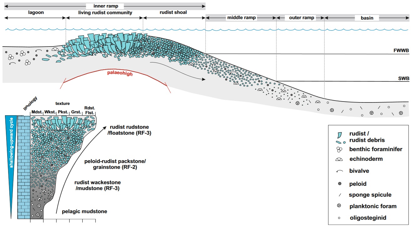 Типичная область распространения рудистовых построек и их фрагментов (отмечены голубым цветом) на примере модели осадконакопления сеноман-туронских отложений залива Дезфул на юго-западе Ирана. Рисунок из статьи B. Esrafili‑Dizaji et al., 2015. Characterization of rudist‑dominated units as potential reservoirs in the middle Cretaceous Sarvak Formation, SW Iran