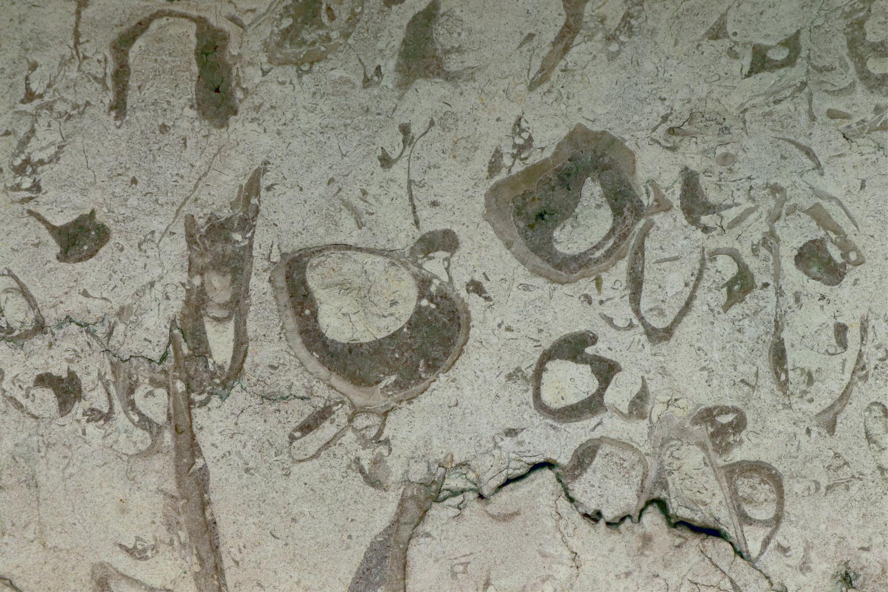 Раскрытый стилолитовый шов, частично заполненный светло-зеленым вторичным карбонатом с примесью меди. Фото Антона Ульяхина, Париж, 26 апреля 2023 года