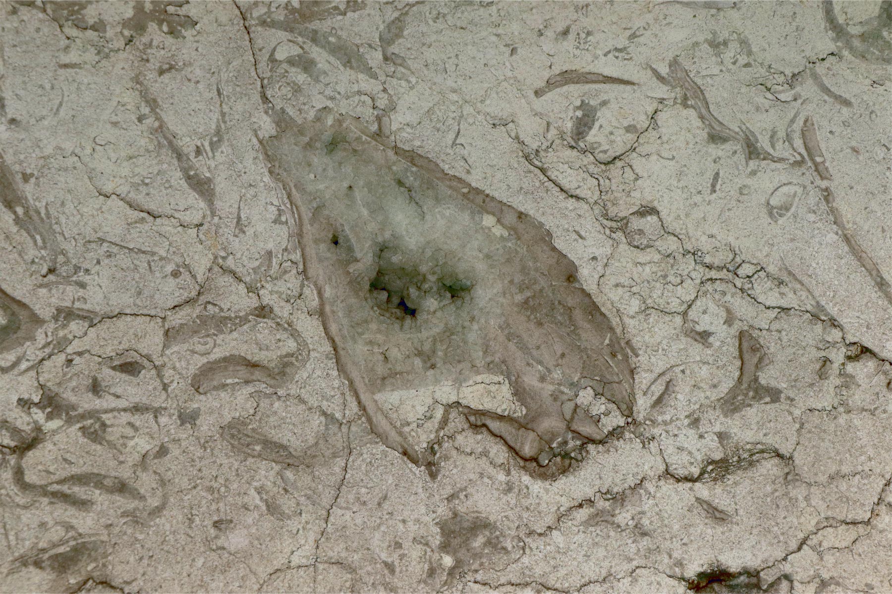 Заполнение раковины рудиста кристаллами вторичного кальцита. Фото Антона Ульяхина, Париж, 26 апреля 2023 года