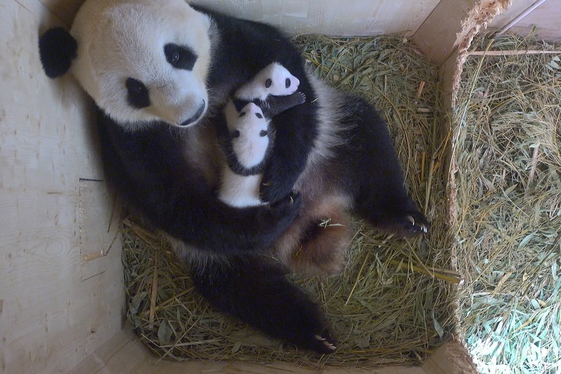 На фото — самка большой панды (Ailuropoda melanoleuca) по имени Ян Ян (Yang Yang) из Шёнбруннского зоопарка в Вене. Она обнимает двух малышей — самочку Фу Фень (Fu Feng) и самца Фу Бан (Fu Ban). Близнецы родились в 2016 году и стали четвертым пометом шестнадцатилетней самки, до этого родившей и воспитавшей трех детенышей мужского пола (она рожала каждые три года, в 2007-м, 2010-м и 2013-м). Близнецы у больших панд в неволе рождаются почти в половине случаев, но без помощи человека выживает, как правило, только один из них. Ян Ян — первая панда-мать, вырастившая двоих детенышей самостоятельно, без помощи человека.