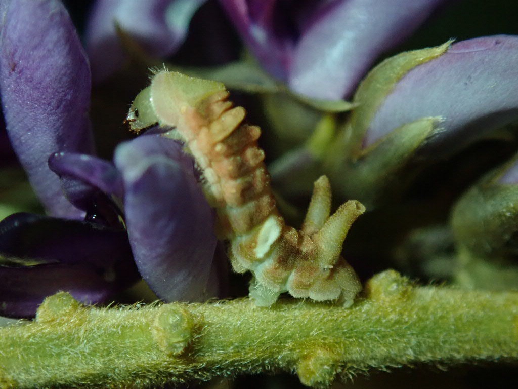 В норме гусеницы рода Curetis окрашены в зеленый цвет, но эта решила полакомиться лепестками фиолетового цвета и приобрела фиолетовую расцветку. Фото © bubibubidksw с сайта inaturalist.org, Китай, 25 августа 2020 года