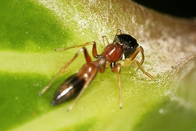 На фото — паук Paraplectana tsushimensis, умело притворяющийся божьей коровкой. Его округлое тело и яркая раскраска всеми силами убеждают окружающих птиц, что перед ними — невкусный жук, клевать которого себе дороже (см. ответ на детский вопрос Почему кузнечик зеленый, а божья коровка красная). Но на самом деле цветастый «наряд» этого паука — чистой воды блеф, и притворщик сравнительно безвреден. Он — представитель кругопрядов (Araneidae), дальний родственник паука-крестовика (Araneus diadematus), и даже укус этого восьминогого «жука» едва ли сможет отпугнуть голодного хищника. Такой вид подражательства безобидного животного опасному носит название бейтсовской мимикрии (см. картинку дня Осиная мимикрия).