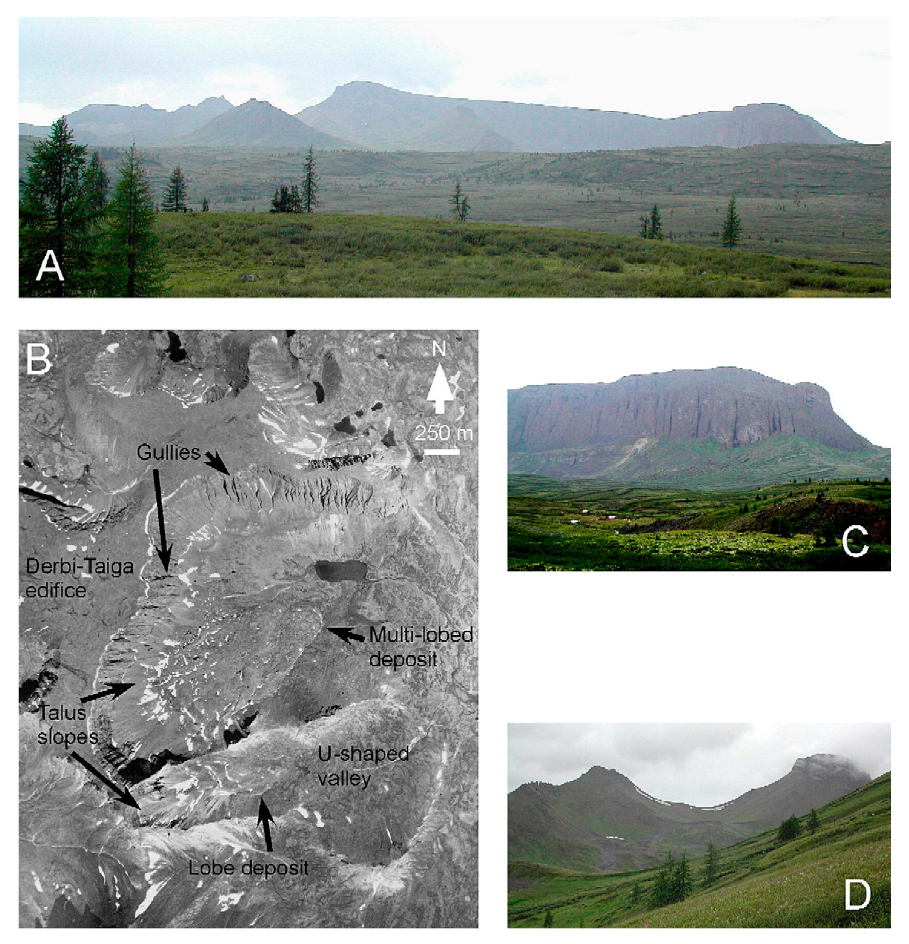 Внешний вид туйи может быть изменен в результате разных процессов: обвалов крутых склонов (C), формирования оврагов из-за стока ручьев и селевых потоков (A–C), долинным оледенением и горными ледниками (D). На A, C, D показан вид на туйю Дерби-Тайга с востока, B — аэрофотоснимок. Фото G. Komatsu из статьи G. Komatsu et al., 2007. Geomorphology of subglacial volcanoes in the Azas Plateau, the Tuva Republic, Russia
