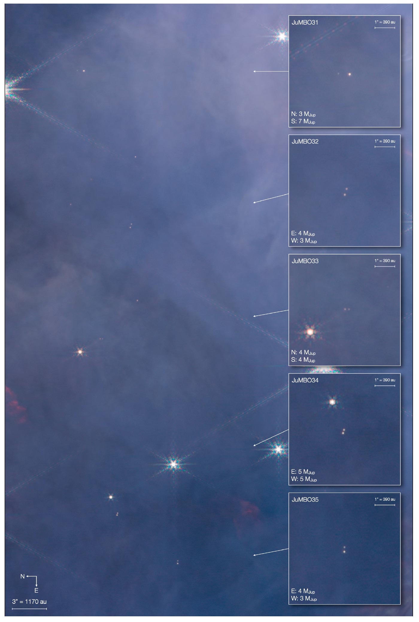 Фрагмент изображения, полученного инфракрасной камерой телескопа «Джеймс Уэбб». На нем изображены пять JuMBO. Возраст каждого из десяти объектов оценивается в миллион лет, масса составляет 3–7 масс Юпитера. Фото из препринта статьи S. G. Pearson, M. J. McCaughrean, 2023. Jupiter Mass Binary Objects in the Trapezium Cluster