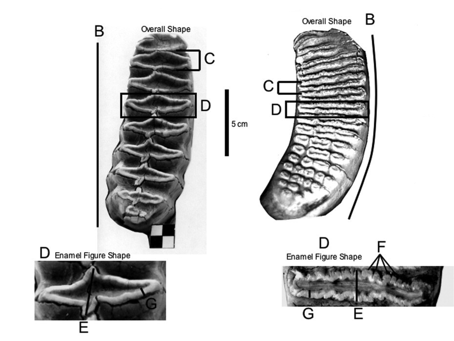 Слева — жевательный зуб саванного слона с ромбовидными гребнями эмали (D). Справа — зуб азиатского слона с цилиндрическими гребнями (D). У саванного слона больше промежуток (C) между гребнями, а также более толстая эмаль (G). Рисунок из статьи N. E. Todd, 2009. Qualitative Comparison of the Cranio-Dental Osteology of the Extant Elephants, Elephas maximus (Asian elephant) and Loxodonta africana (African elephant)