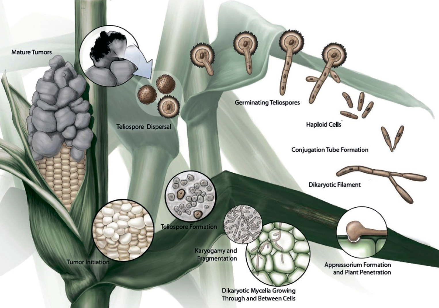 Жизненный цикл Ustilago maydis. Изображение из книги Meiosis — Molecular Mechanisms and Cytogenetic, глава: B. Saville, M. Donaldson, C. E. Doyle, 2011. Investigating Host Induced Meiosis in a Fungal Plant Pathogen