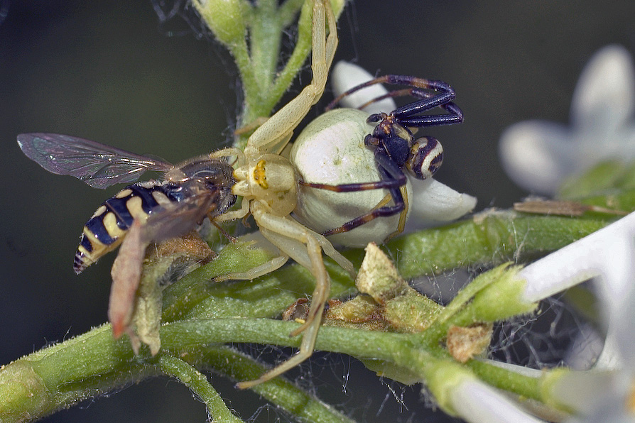 Крабовые пауки — засадники. Сетей не плетут, прячутся среди лепестков или цветочков, иногда на листьях, поджидая добычу. На фото хорошо видно, что две передние пары ног у паука длиннее прочих и широко расставлены. Паук готов к нападению. Как только насекомое-опылитель садится поблизости, паук бросается на него, вцепляется передними ногами и впрыскивает яд.