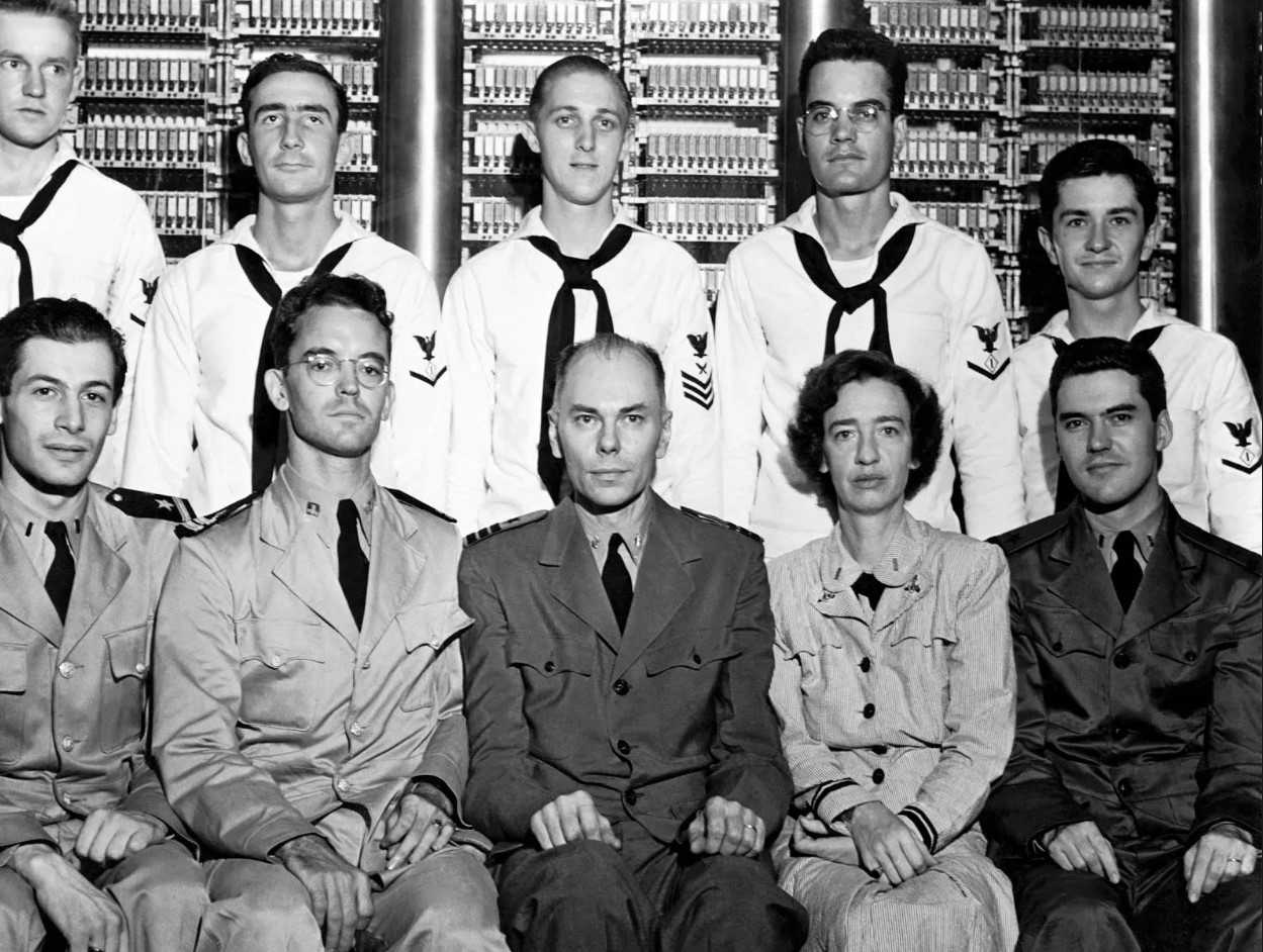 Говард Эйкен (сидит по центру) и Грейс Хоппер (справа от него) вместе с командой обслуживания «Марка I» на фоне компьютера, 1944 год. Фото с сайта britannica.com