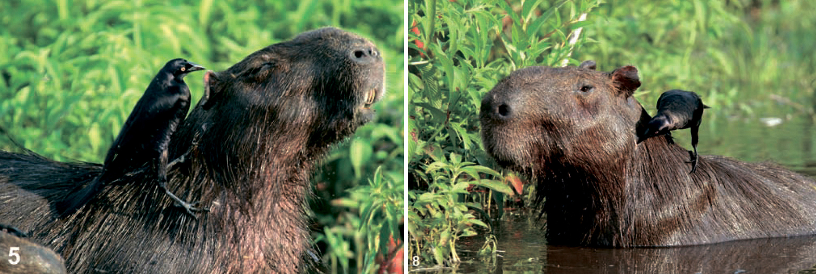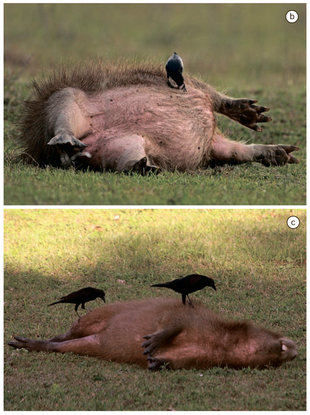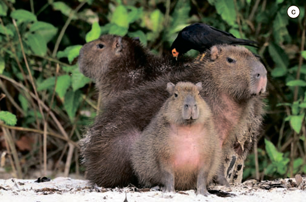Птицы чистят брюшко капибары: b — блестящий коровий трупиал, c — большие воловьи птицы. Фото из статьи I. Sazima, C. Sazima, 2010. Brazilian cleaner birds: update and brief reappraisal