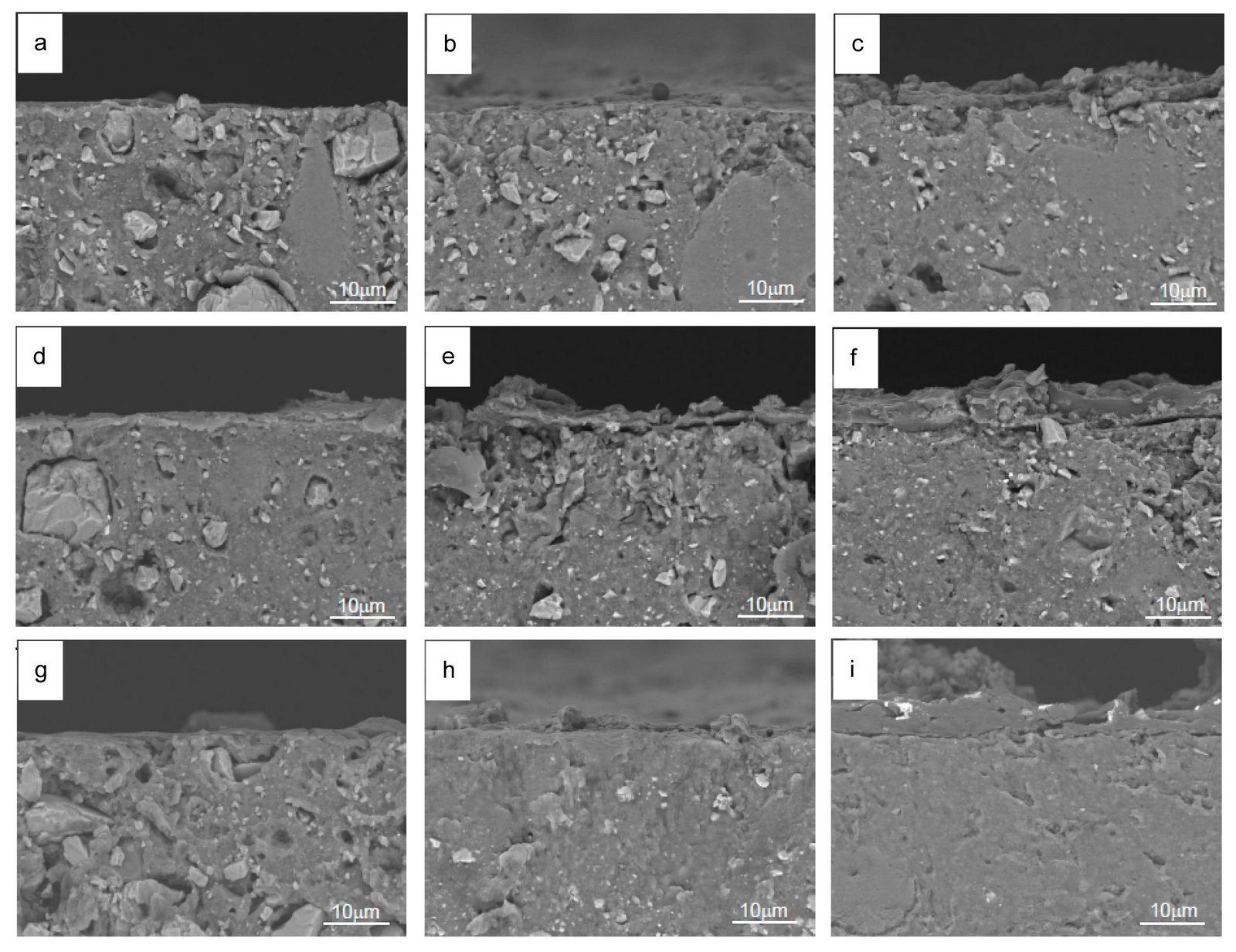 Поперечный срез подповерхностной области листов вулканизированной резины в сканирующем электронном микроскопе. a, d, g — необработанная резина после 1, 2 и 3 месяцев эксперимента; b, e, h — резина, обработанная культурой трихаптума пихтового после 1, 2 и 3 месяцев соответственно; c, f, i — резина, обработанная культурой трихаптума двоякого. Фото из препринта статьи S. Sato et al, 2022. Deterioration of vulcanized natural rubber sheets is associated with removal of calcium carbonate filler by wood-decay fungi Trichaptum abietinum and Trichaptum biforme