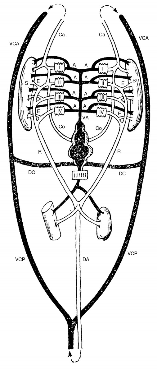 Значительно упрощенная схема кровообращения клариаса. Теперь мы смотрим на рыбу не сбоку, а сверху, со стороны спины. Сосуды, по которым течет венозная кровь, залиты черным; сосуды, по которым течет артериальная кровь, оставлены белыми. Римские цифры обозначают жабры, S — наджаберные органы воздушного дыхания. Другие сокращения: VA — брюшная аорта, A — приносящие жаберные артерии, E — выносящие жаберные артерии, R — корни спинной аорты, Ca — сонные артерии, Co — коронарные артерии, DA — спинная аорта, VCA — передняя полая вена, VCP — задняя полая вена, DC — кювьеров проток. Пунктирные стрелки обозначают прохождение крови по капиллярам большого круга кровообращения, сопровождающееся ее превращением из артериальной в венозную. По Леониду Петровичу Татаринову из статьи H. Szarski, 1962. The origin of the Amphibia