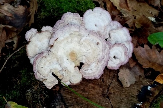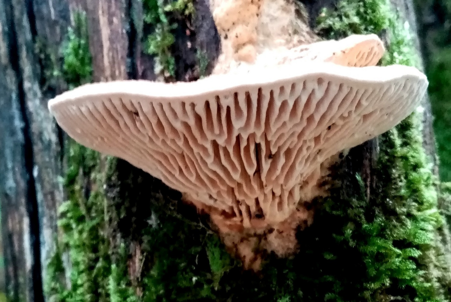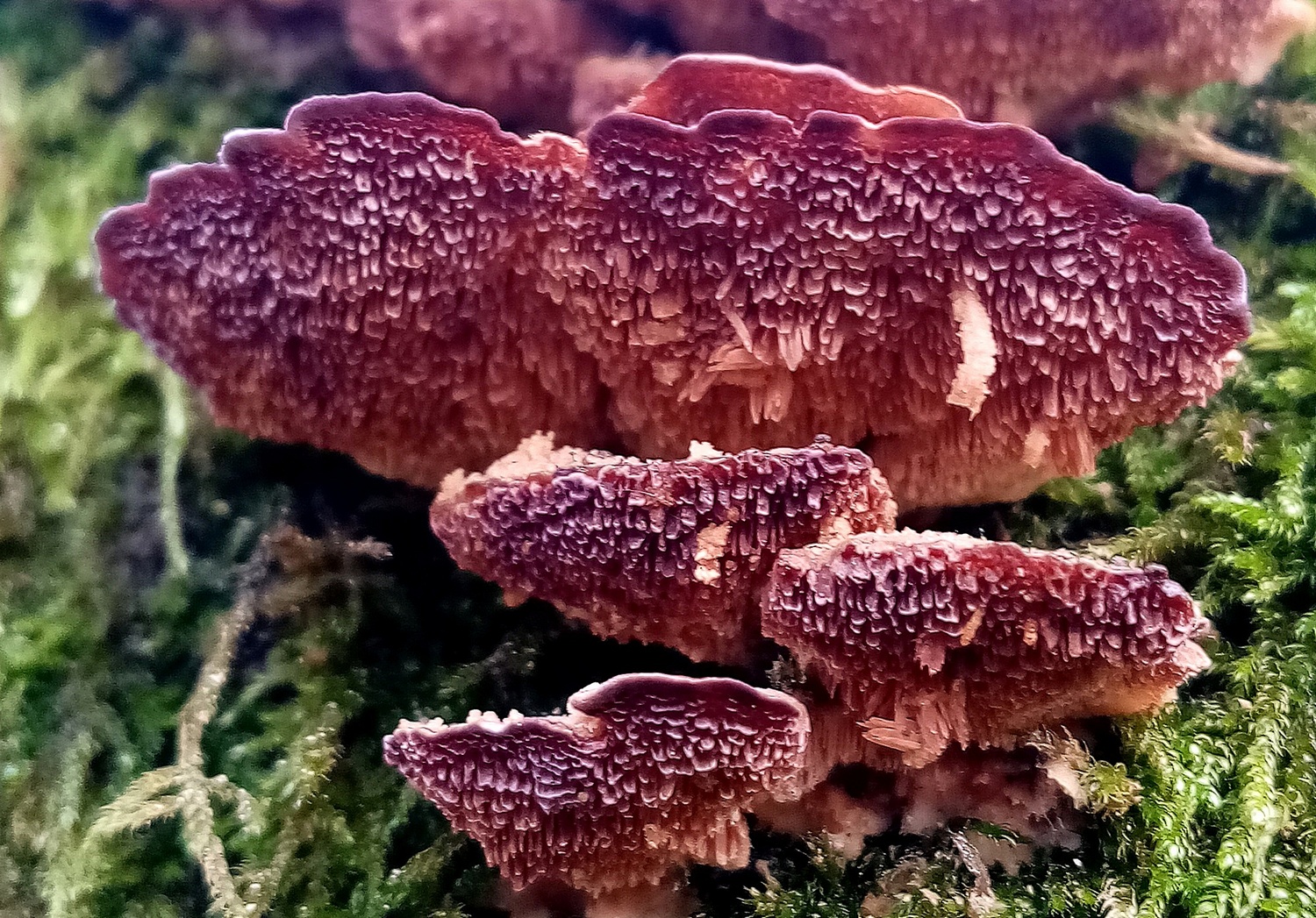 На фото — нижняя сторона плодового тела трихаптума двоякого (Trichaptum biforme), симпатичного однолетнего трутовика, разлагающего мертвую древесину (то есть сапротрофа). Трутовики — это такая спорная парафилетическая группа базидомицетов, в которую включают растущие на древесине грибы с преимущественно трубчатым гименофором и жесткой мякотью. При этом трубочки могут сильно срастаться, и такой гименофор можно назвать пористым. Название «трутовики» эта группа получила из-за использования плодовых тел некоторых грибов в качестве трута — легковоспламеняющегося материала (см. картинку дня Гриб художников).