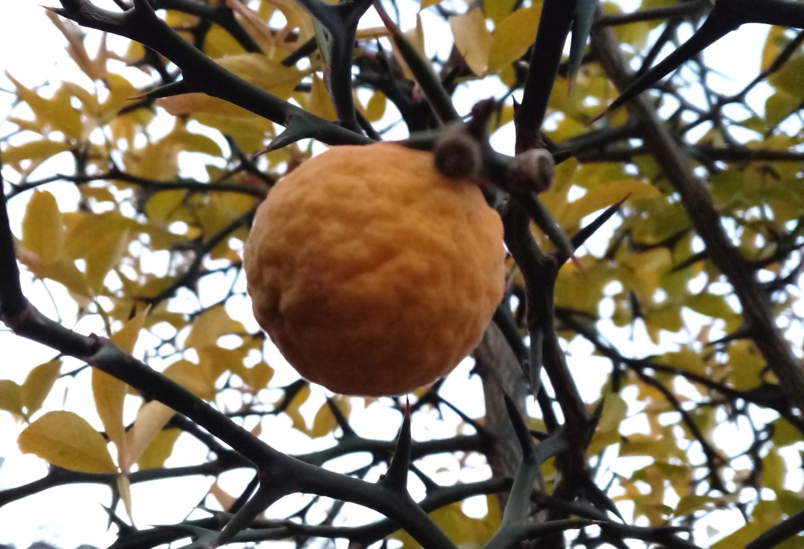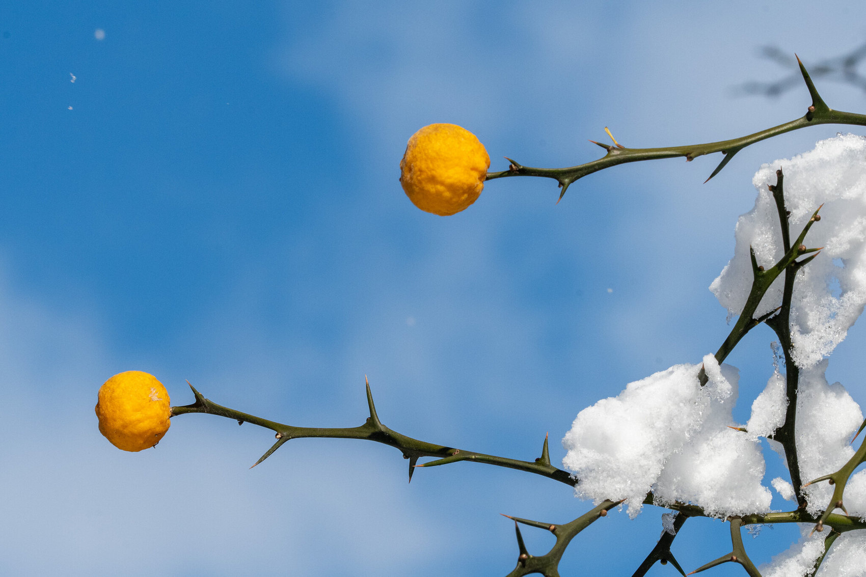 На фото — плоды понцируса трехлисточкового (Citrus trifoliata) в заснеженном Проспект-парке Нью-Йорка. Это не внезапные заморозки, фото сделано в январе. Просто это растение отличается от всех других цитрусов повышенной морозостойкостью, а также листопадностью. Понцирус трехлисточковый представляет собой невысокое деревце или кустарник, сплюснутые ветви которого несут устрашающие прочные колючки длиной до 5 см. «Трехлисточковым» понцирус назван из-за строения сложного листа, состоящего из одной центральной и двух боковых долей. Листики при растирании издают характерный для цитрусовых аромат.