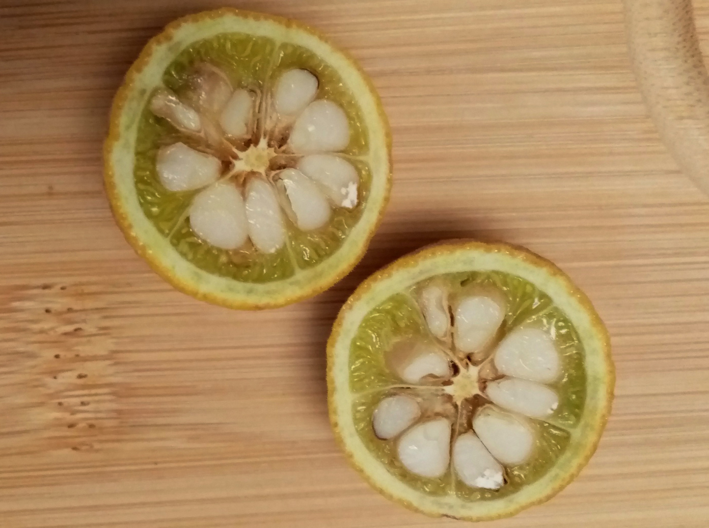 Понцирус в разрезе. Доля семян заметно больше, чем мякоти. Фото Татьяны Натальиной, Краснодарский край, декабрь 2024 года