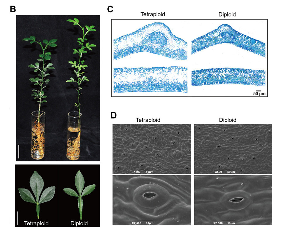 B — тетраплоидные растения понцируса более низкорослые, чем диплоидные, листья у них шире и толще. Длина масштабных отрезков — 4 см и 1 см. C — на поперечных срезах заметны более крупные клетки тетраплоида и более толстый эпидермис. D — у тетраплоидов более крупные устьица, и их плотность ниже по сравнению с диплоидами. Фото из статьи Y. ue Wang et al., 2022. CHH methylation of genes associated with fatty acid and jasmonate biosynthesis contributes to cold tolerance in autotetraploids of Poncirus trifoliate