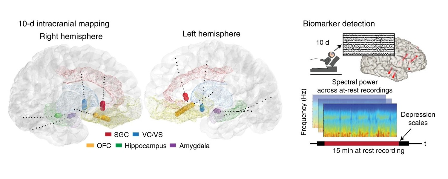 Недавно удалось внедрить новые устройства, способные как регистрировать нейронную активность, так и производить стимуляцию. В 2019 году 36-летней женщине, с детства страдавшей тяжелой депрессией, которая не поддавалась лечению, имплантировали 10 электродов в области мозга, ранее определенные как наиболее перспективные для модуляции депрессивного состояния. Эти устройства могли как записывать нейронную активность (см. Stereoelectroencephalography), так и стимулировать мозг с помощью глубокой стимуляции. В течение 10 дней исследователи регистрировали электрическую активность выбранных областей мозга и анализировали ее в различных частотных диапазонах (см. Ритмы головного мозга), сопоставляя полученные значения с эмоциональным состоянием пациентки с помощью машинного обучения. Ученые обнаружили, что мощность гамма-ритма (см. Gamma wave), регистрируемая билатерально от миндалевидного тела, надежно предсказывает ухудшение состояния пациентки. А улучшение состояния было связано со стимуляцией вентральной капсулы и вентрального полосатого тела (см. Ventral striatum) в правом полушарии. Далее ученые с помощью диффузионно-тензорной магнитно-резонансной томографии, позволяющей визуализировать проводящие пути белого вещества, показали, что эти области анатомически связаны. Более того, участки были связаны и функционально: оказалось, что стимуляция вентральной капсулы и полосатого тела справа снижала мощность гамма-ритма, регистрируемую от миндалевидного тела!