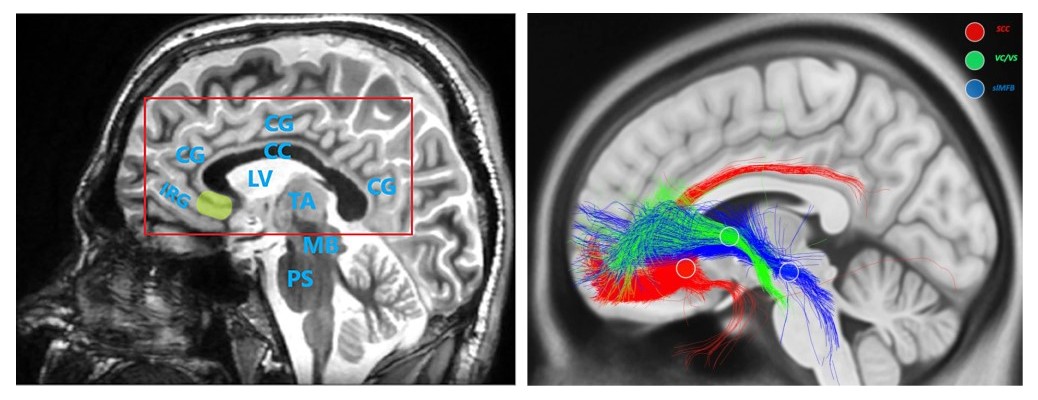 Слева — структурное магнитно-резонансное изображение, на котором не видно связей между областями. Зеленым цветом отмечена SCC; CC — мозолистое тело; CG — поясная извилина; IRG — нижняя ростральная извилина; LV — боковой желудочек; MB — средний мозг; PS — мост; TA — таламус. Изображение из статьи M. Sobstyl et al., 2022. Subcallosal cingulate cortex deep brain stimulation for treatment-resistant depression: a systematic review. Справа — изображение, полученное с помощью диффузионно-тензорной магнитно-резонансной томографии. Потенциальные цели для ГСМ при депрессии (обведены белым) и активированные связи этих областей: SCC (красный), VC/VS (зеленый) и MFB (синий). Изображение из статьи D. R. Roalf, M. Figee, D. J. Oathes, 2024. Elevating the field for applying neuroimaging to individual patients in psychiatry