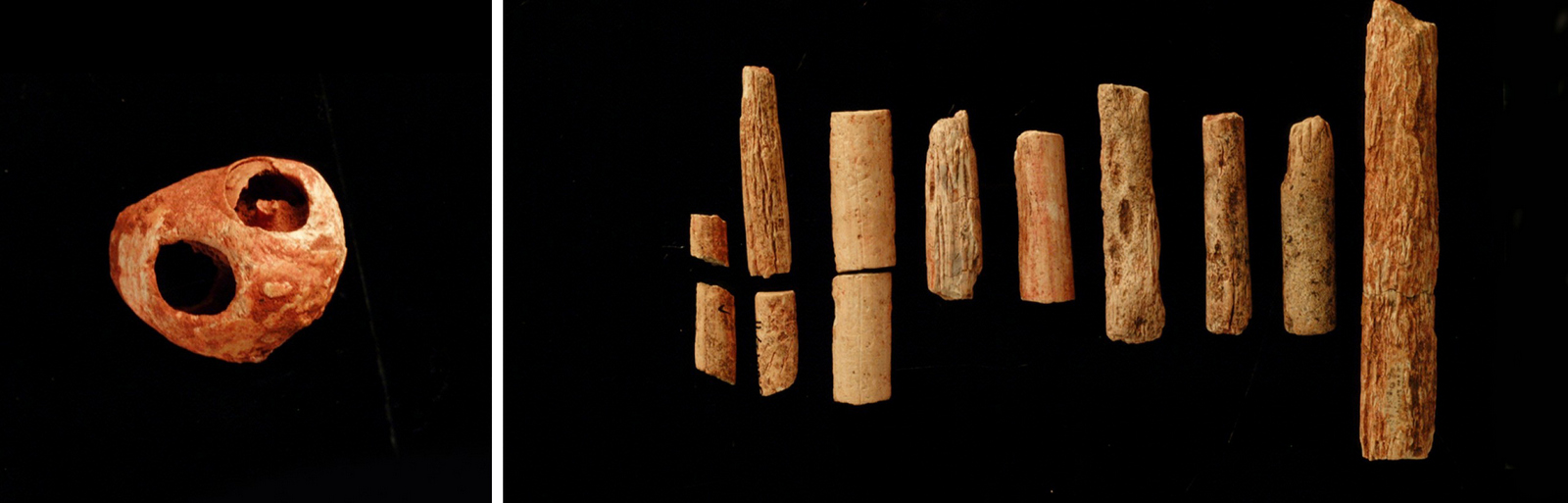 Слева — одна из подвесок, сделанных из раковины моллюска. Справа — фрагменты стержней из бивня мамонта