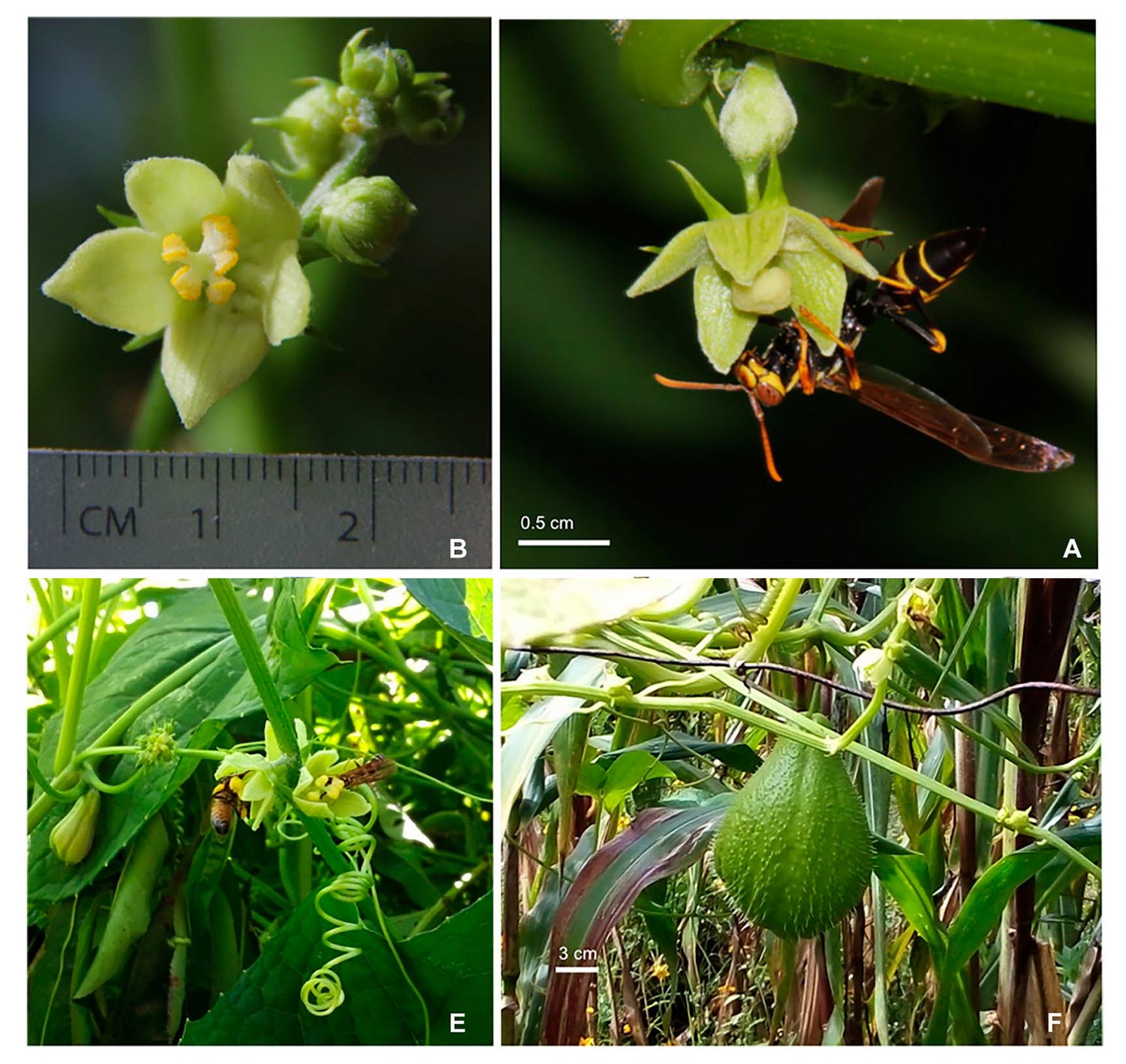 Цветы и плод чайота. B — тычиночный цветок; A — пестичный цветок, на котором пьет нектар оса Polistes instabilis; E — медоносная пчела и оса Agelaia sp. питаются нектаром на тычиночном цветке, слева заметен развивающийся плод; F — зрелый плод. Фото из статьи A. E. Martínez-Bauer, R. Vandame, G. Cerón-Martínez, 2021. More than the usual suspect: diversity of pollinators of chayote (Sechium edule) at high elevations in Chiapas, Mexico