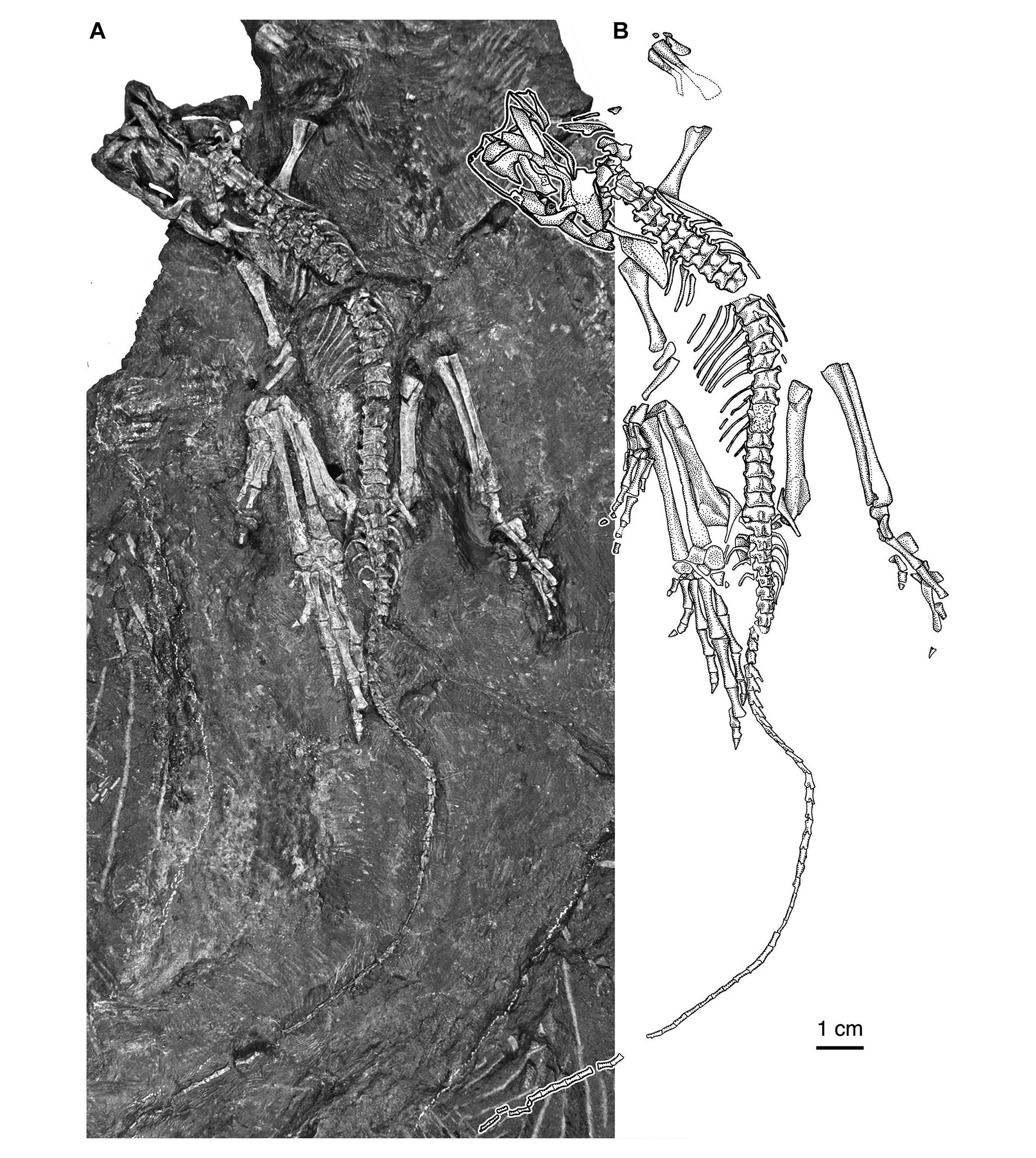 Скелет эудибама и его прорисовка. Обратите внимание на необычайно длинные задние конечности: их общая длина составляет около 135% от длины туловища животного. Изображение из статьи D. S. Berman et al., 2021. The Early Permian Bolosaurid Eudibamus cursoris: Earliest Reptile to Combine Parasagittal Stride and Digitigrade Posture During Quadrupedal and Bipedal Locomotion