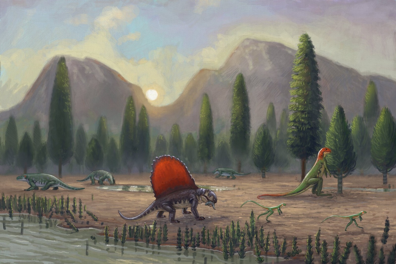 В ранней перми Центральная Германия была горной местностью, изолированной от низменных пойм. Источниками воды здесь служили эфемерные озера, так что остатков рыб или полуводных тетрапод в Тамбахе найдено не было. Обратите внимание на животное в верхнем правом углу: это пока не описанная болозаврида, по предварительным оценкам достигавшая метра в длину. Был ли это родственник эудибама — или, возможно, взрослая особь этого же вида? Рисунок © Bálint Benke с сайта artstation.com