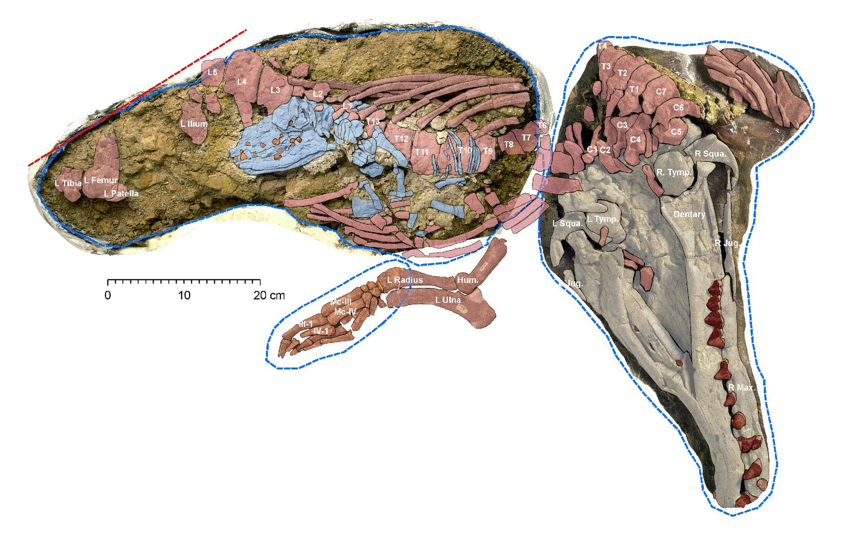Голотип майяцета: череп взрослой самки окрашен в бежевый цвет, ее зубы — коричневые, посткраниальный скелет — красный. Скелет плода выделен голубым, с коричневыми зубами. Синими пунктирными линиями обозначены контуры трех блоков вмещающей породы, а красной пунктирной линией обозначена граница эрозии. Рисунок из статьи P. D. Gingerich et al., 2009. New Protocetid Whale from the Middle Eocene of Pakistan: Birth on Land, Precocial Development, and Sexual Dimorphism