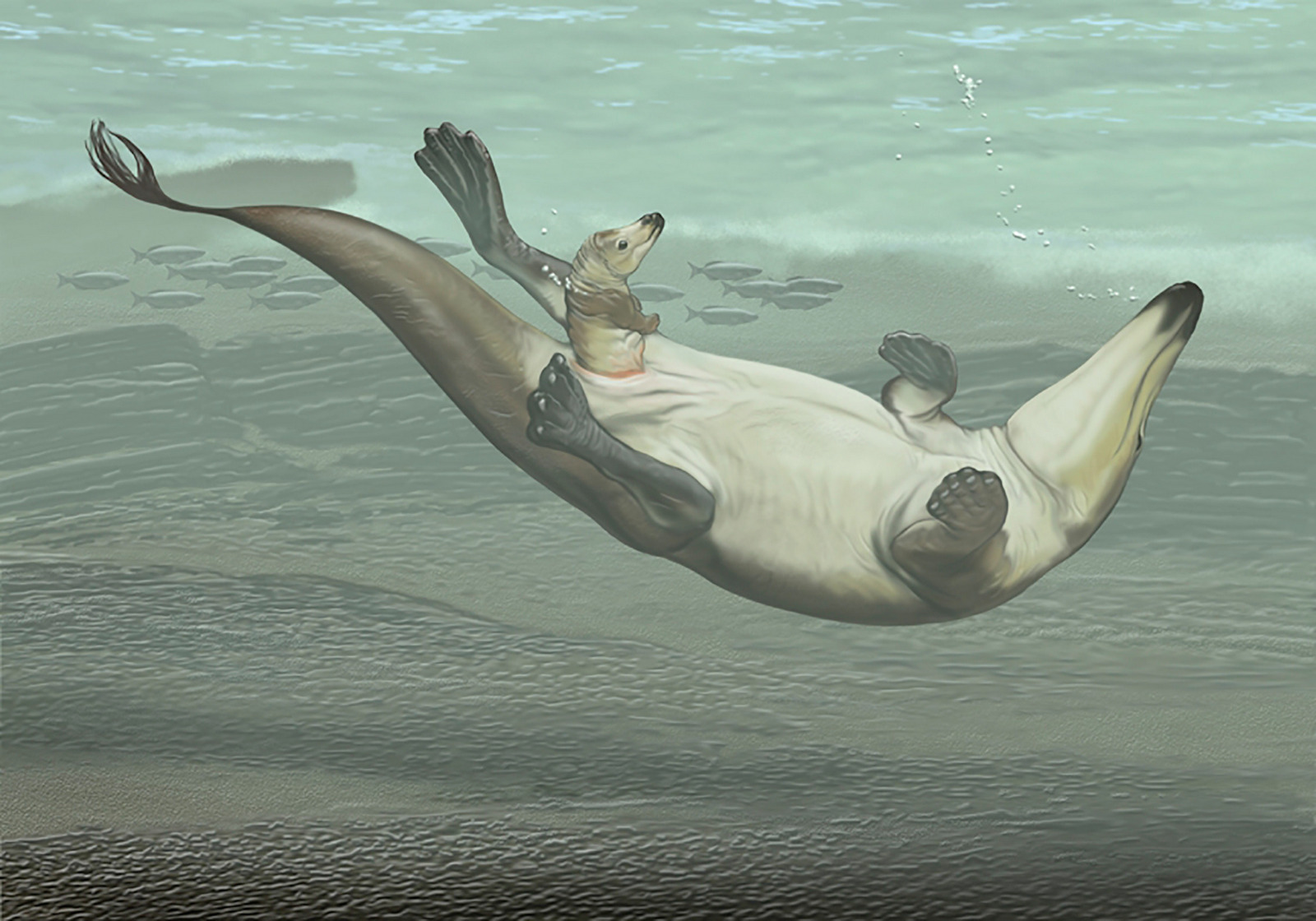 Реконструкция родов майяцета. Современные бегемоты иногда рожают детенышей под водой головой вперед, так что не исключено, что и у майяцетов такие роды были в порядке вещей. Рисунок © Carl Buell из статьи Geisler, 2019. Whale Evolution: Dispersal by Paddle or Fluke