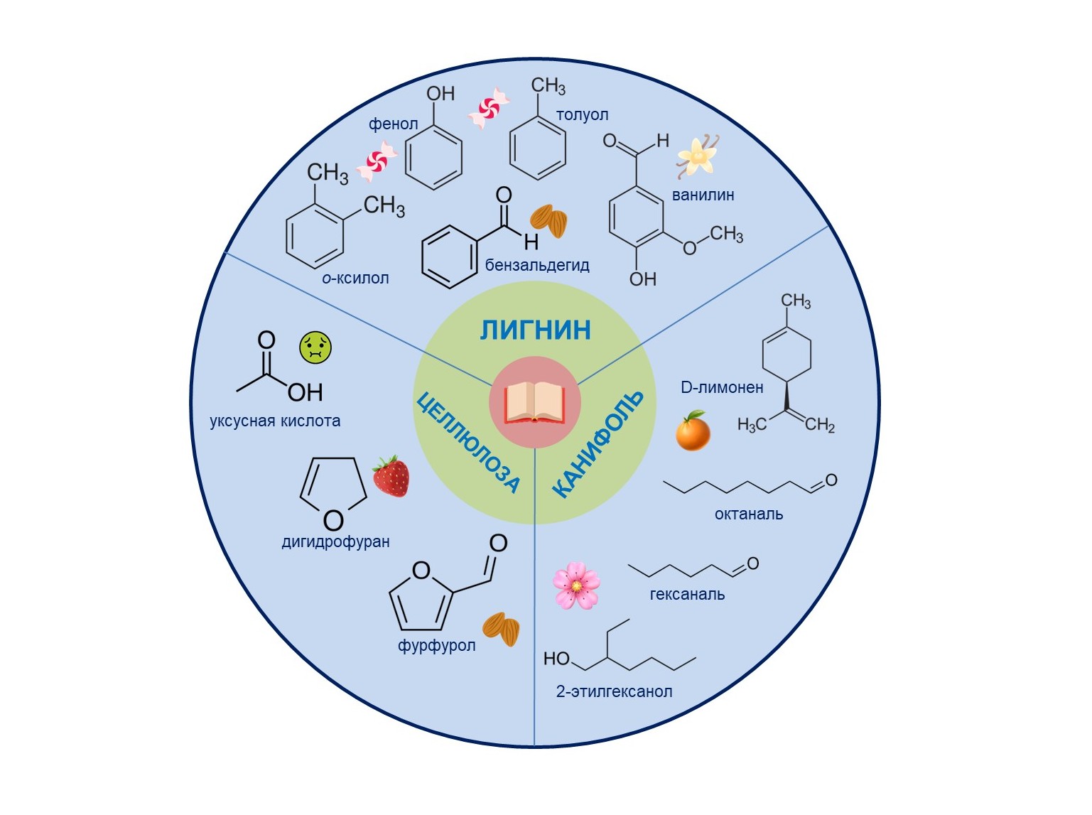 Среди летучих веществ, обнаруженных в старых книгах, к продуктам разложения лигнина относятся о-ксилол, фенол, толуол, бензальдегид и ванилин. Первые три соединения обладают сладковато-«химическими» запахами, бензальдегид пахнет миндалем, а ванилин, естественно, ванилью. Кстати, не стоит удивляться наличию ванилина среди продуктов разложения лигнина — ведь существует даже такой промышленный способ получения этого ароматного порошка!
