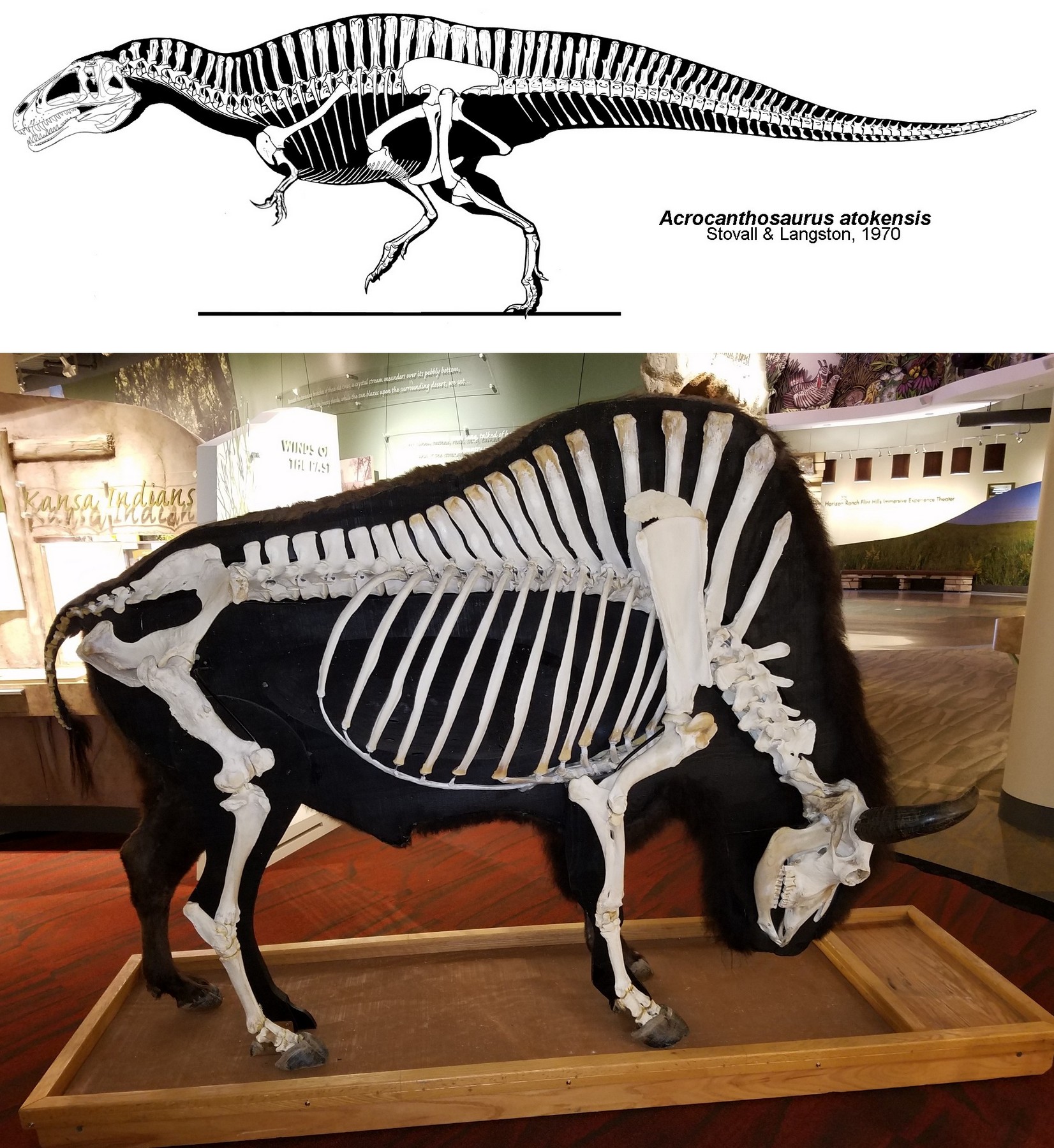 Реконструкция скелета акрокантозавра (вверху; рисунок © Jaime A. Headden с сайта commons.wikimedia.org) и скелет американского бизона (внизу; фото © Xerxes2004 с сайта commons.wikimedia.org)